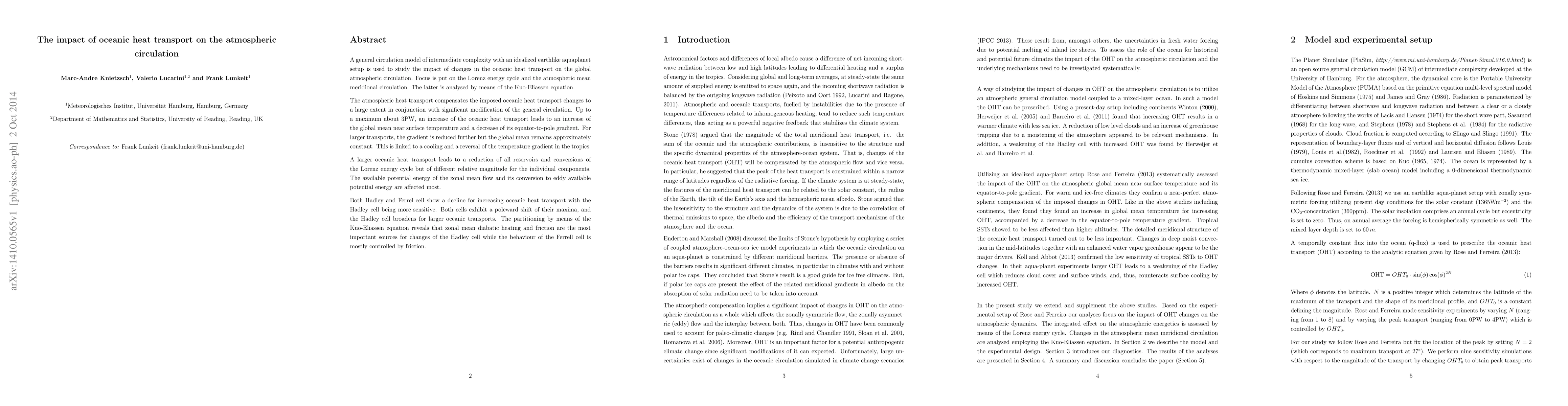 This study uses a general circulation model to investigate how changes in oceanic heat transport affect global atmospheric circulation, focusing on the Lorenz energy cycle and mean meridional circulation. Results show that increased oceanic heat transport up to 3PW raises global mean temperatures and reduces the equator-to-pole temperature gradient, while larger transports lead to tropical cooling and a reversed gradient. The Lorenz energy cycle and meridional circulation cells, especially the Hadley cell, are significantly altered, with both cells shifting poleward and the Hadley cell broadening.