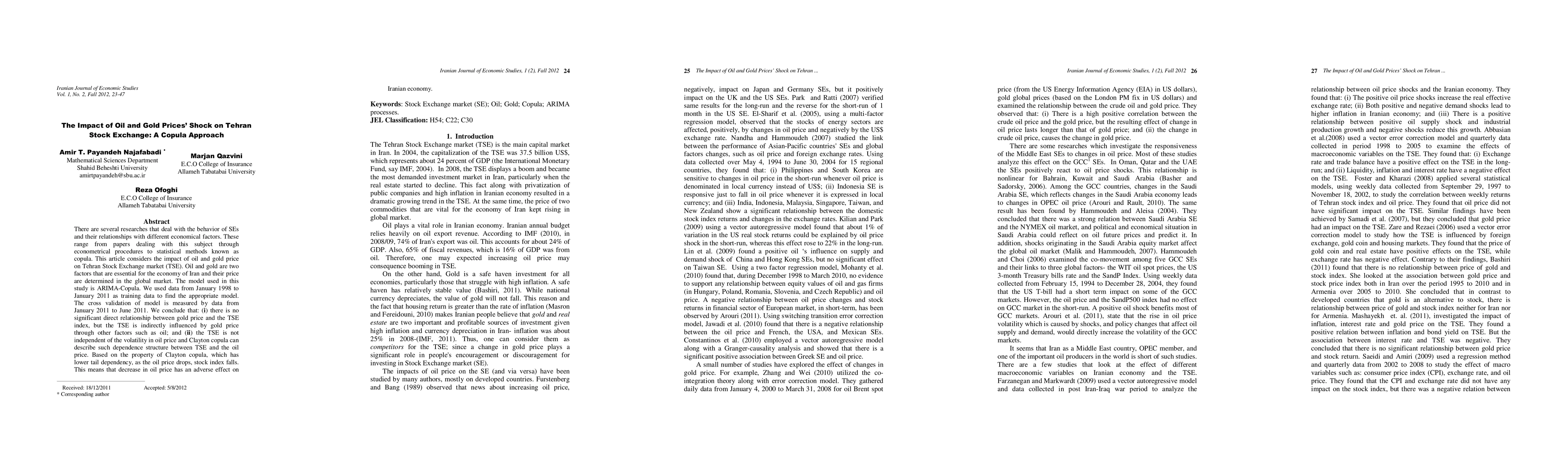 This study employs an ARIMA-Copula model to analyze the impact of oil and gold prices on the Tehran Stock Exchange (TSE) from 1998 to 2011. Findings indicate no direct relationship between gold prices and TSE, but an indirect influence via oil prices, and significant volatility dependence between TSE and oil prices, described by Clayton copula, showing adverse effects on the economy when oil prices drop.