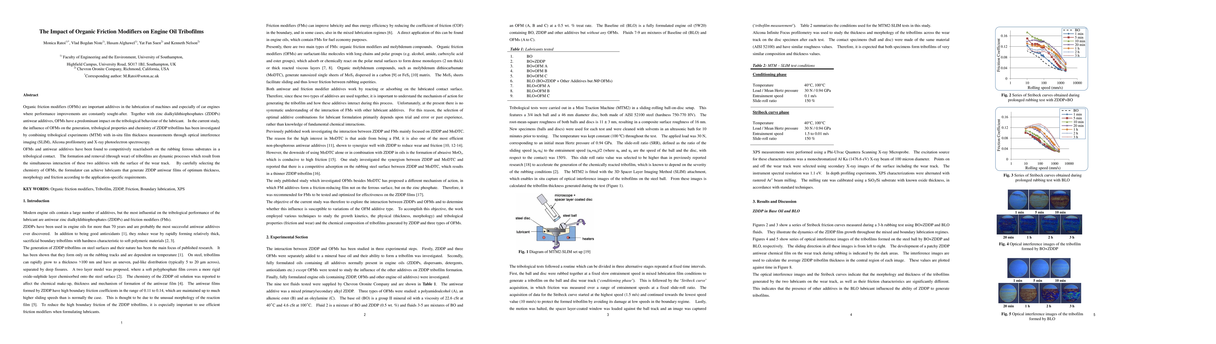 Organic friction modifiers (OFMs) are important additives in the lubrication of machines and especially of car engines where performance improvements are constantly sought-after. Together with zinc dialkyldithiophosphates (ZDDPs) antiwear additives, OFMs have a predominant impact on the tribological behaviour of the lubricant. In the current study, the influence of OFMs on the generation, tribological properties and chemistry of ZDDP tribofilms has been investigated by combining tribological experiments (MTM) with in-situ film thickness measurements through optical interference imaging (SLIM), Alicona profilometry and X-ray photoelectron spectroscopy. OFMs and antiwear additives have been found to competitively react/adsorb on the rubbing ferrous substrates in a tribological contact. The formation and removal (through wear) of tribofilms are dynamic processes which result from the simultaneous interaction of these two additives with the surface of the wear track. By carefully selecting the chemistry of OFMs, the formulator can achieve lubricants that generate ZDDP antiwear films of optimum thickness, morphology and friction according to the application-specific requirements.