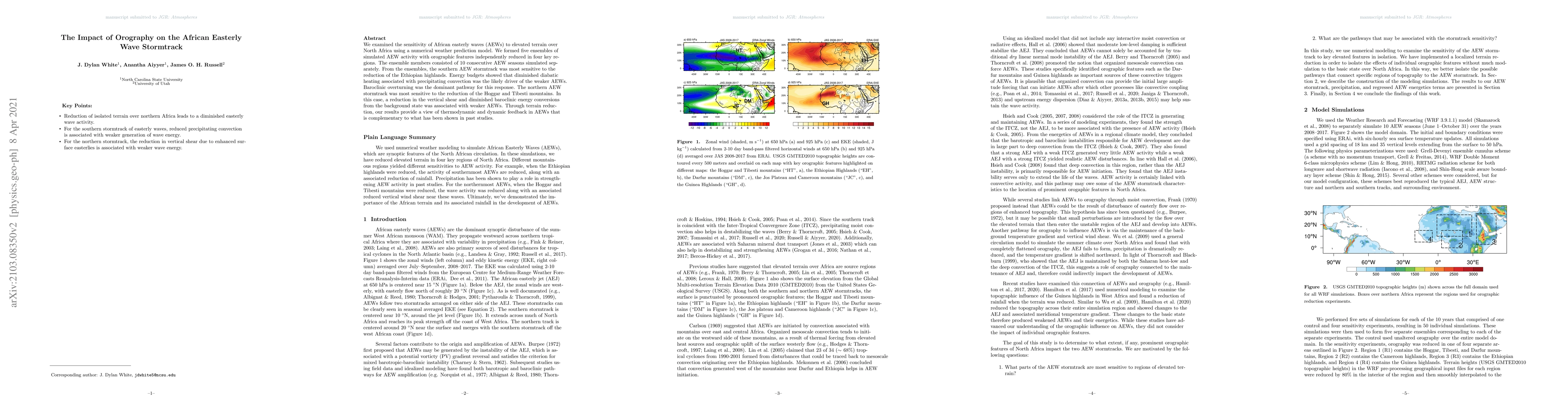 Numerical model simulations show that terrain elevation in North Africa affects African easterly waves differently across two stormtracks: the southern track is more sensitive to Ethiopian highlands, while the northern track is more sensitive to Hoggar and Tibesti mountains.
