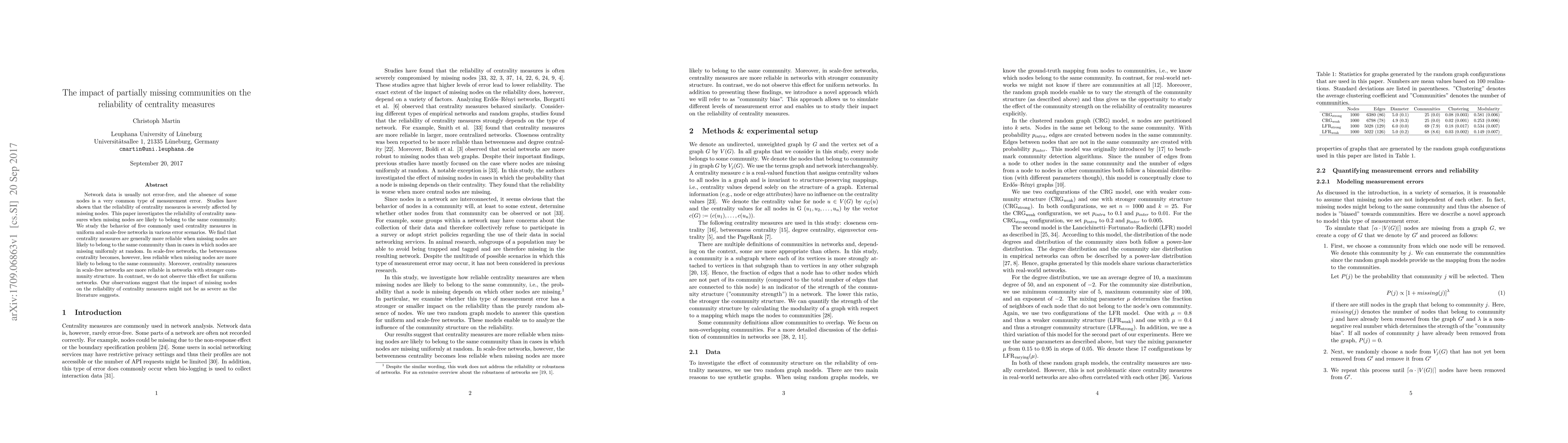 Network data is usually not error-free, and the absence of some nodes is a very common type of measurement error. Studies have shown that the reliability of centrality measures is severely affected by missing nodes. This paper investigates the reliability of centrality measures when missing nodes are likely to belong to the same community. We study the behavior of five commonly used centrality measures in uniform and scale-free networks in various error scenarios. We find that centrality measures are generally more reliable when missing nodes are likely to belong to the same community than in cases in which nodes are missing uniformly at random. In scale-free networks, the betweenness centrality becomes, however, less reliable when missing nodes are more likely to belong to the same community. Moreover, centrality measures in scale-free networks are more reliable in networks with stronger community structure. In contrast, we do not observe this effect for uniform networks. Our observations suggest that the impact of missing nodes on the reliability of centrality measures might not be as severe as the literature suggests.
