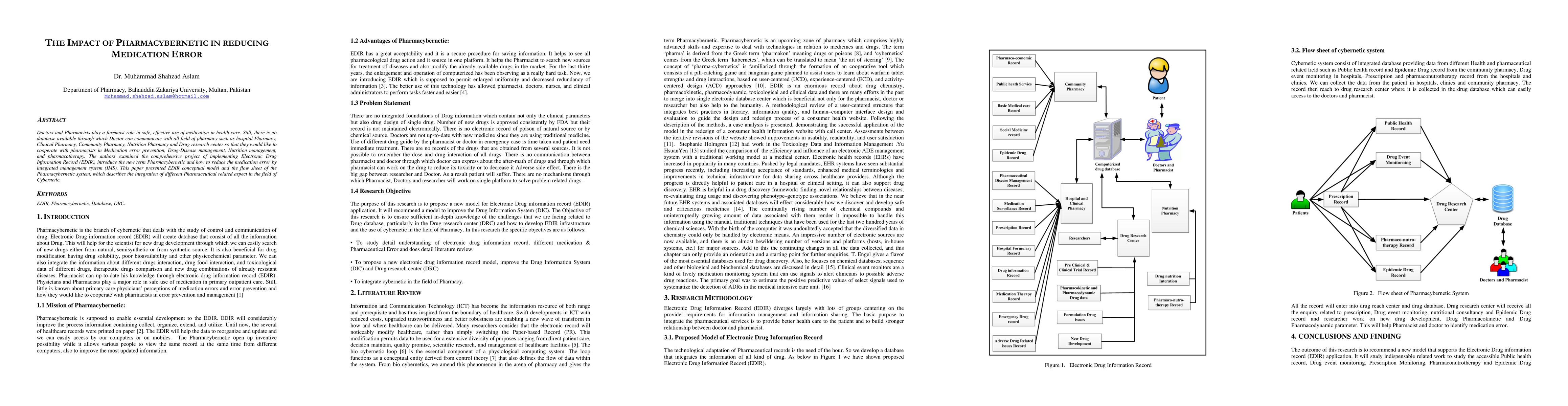 Doctors and Pharmacists play a foremost role in safe, effective use of medication in health care. Still, there is no database available through which Doctor can communicate with all field of pharmacy such as hospital Pharmacy, Clinical Pharmacy, Community Pharmacy, Nutrition Pharmacy and Drug research center so that they would like to cooperate with pharmacists in Medication error prevention, Drug-Disease management, Nutrition management, and pharmacotherapy. The authors examined the comprehensive project of implementing Electronic Drug Information Record (EDIR), introduce the new term Pharmacybernetic and how to reduce the medication error by integrated management system (IMS). This paper presented EDIR conceptual model and the flow sheet of the Pharmacybernetic system, which describes the integration of different Pharmaceutical related aspect in the field of Cybernetic.