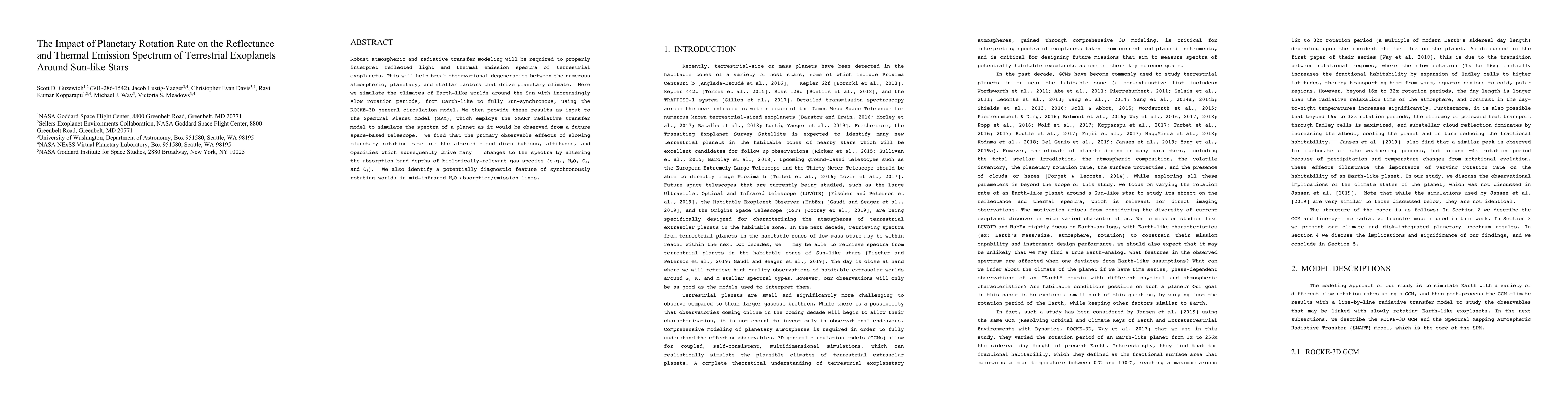Robust atmospheric and radiative transfer modeling will be required to properly interpret reflected light and thermal emission spectra of terrestrial exoplanets. This will help break observational degeneracies between the numerous atmospheric, planetary, and stellar factors that drive planetary climate. Here we simulate the climates of Earth-like worlds around the Sun with increasingly slow rotation periods, from Earth-like to fully Sun-synchronous, using the ROCKE-3D general circulation model. We then provide these results as input to the Spectral Planet Model (SPM), which employs the SMART radiative transfer model to simulate the spectra of a planet as it would be observed from a future space-based telescope. We find that the primary observable effects of slowing planetary rotation rate are the altered cloud distributions, altitudes, and opacities which subsequently drive many changes to the spectra by altering the absorption band depths of biologically-relevant gas species (e.g., H2O, O2, and O3). We also identify a potentially diagnostic feature of synchronously rotating worlds in mid-infrared H2O absorption/emission lines.
