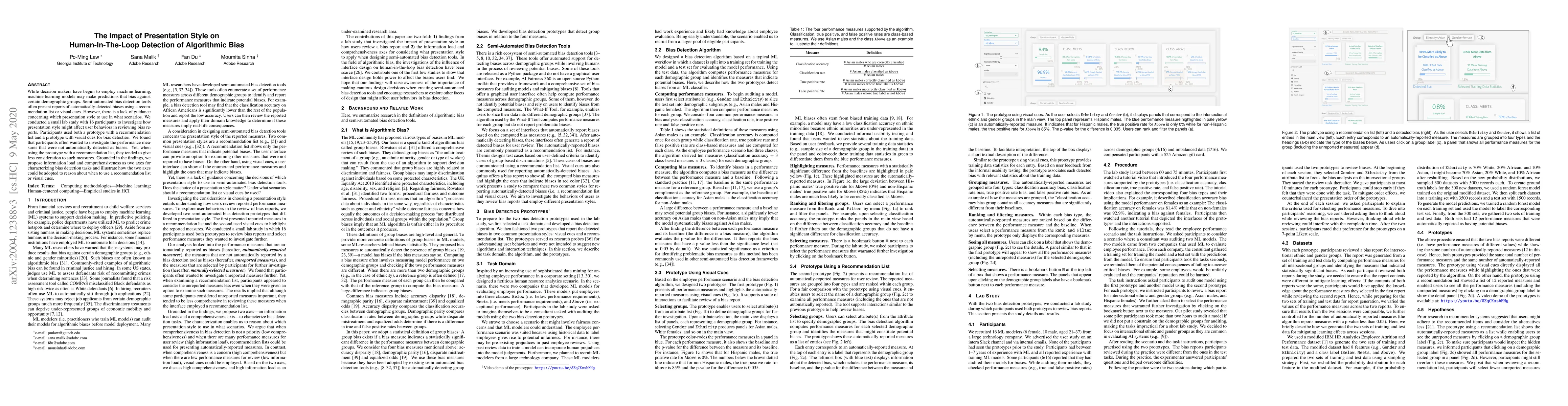 While decision makers have begun to employ machine learning, machine learning models may make predictions that bias against certain demographic groups. Semi-automated bias detection tools often present reports of automatically-detected biases using a recommendation list or visual cues. However, there is a lack of guidance concerning which presentation style to use in what scenarios. We conducted a small lab study with 16 participants to investigate how presentation style might affect user behaviors in reviewing bias reports. Participants used both a prototype with a recommendation list and a prototype with visual cues for bias detection. We found that participants often wanted to investigate the performance measures that were not automatically detected as biases. Yet, when using the prototype with a recommendation list, they tended to give less consideration to such measures. Grounded in the findings, we propose information load and comprehensiveness as two axes for characterizing bias detection tasks and illustrate how the two axes could be adopted to reason about when to use a recommendation list or visual cues.