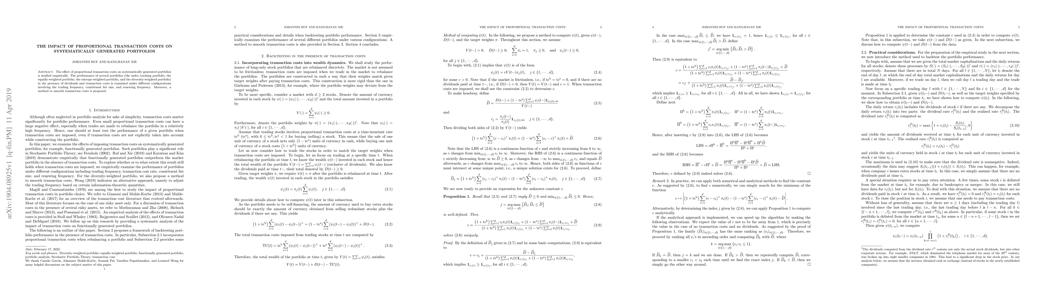 This paper empirically investigates the impact of proportional transaction costs on various systematically generated portfolios, including index, equally-weighted, entropy-weighted, and diversity-weighted portfolios, under different trading and renewing frequencies. A method to smooth transaction costs is also proposed.