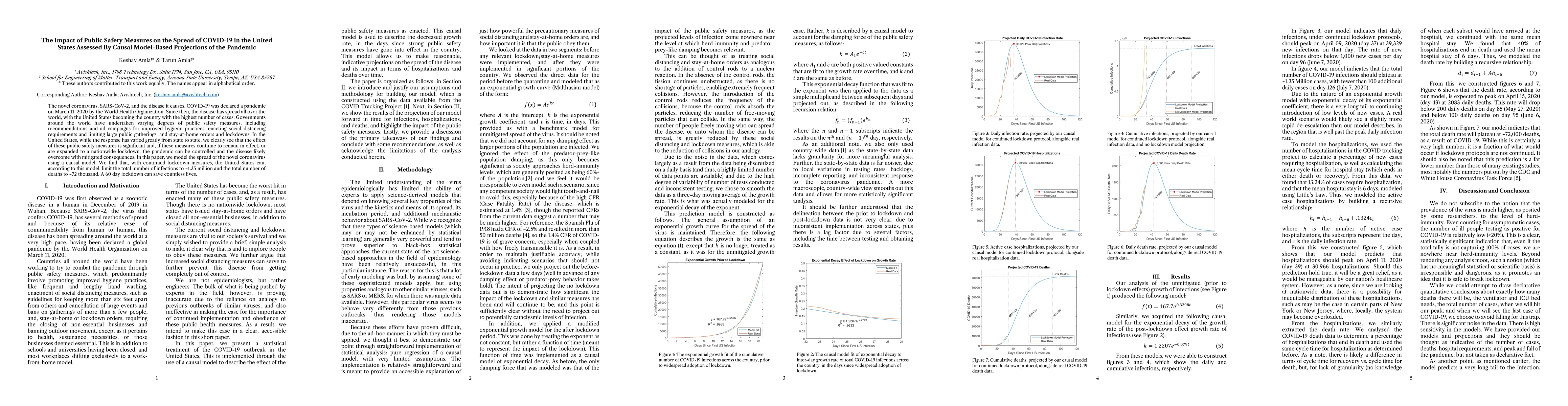 This paper uses a causal model to project the impact of public safety measures on COVID-19 spread in the U.S., finding that continued lockdown measures could limit infections to ~1.35 million and deaths to ~72 thousand, highlighting the significant role of these interventions in controlling the pandemic.
