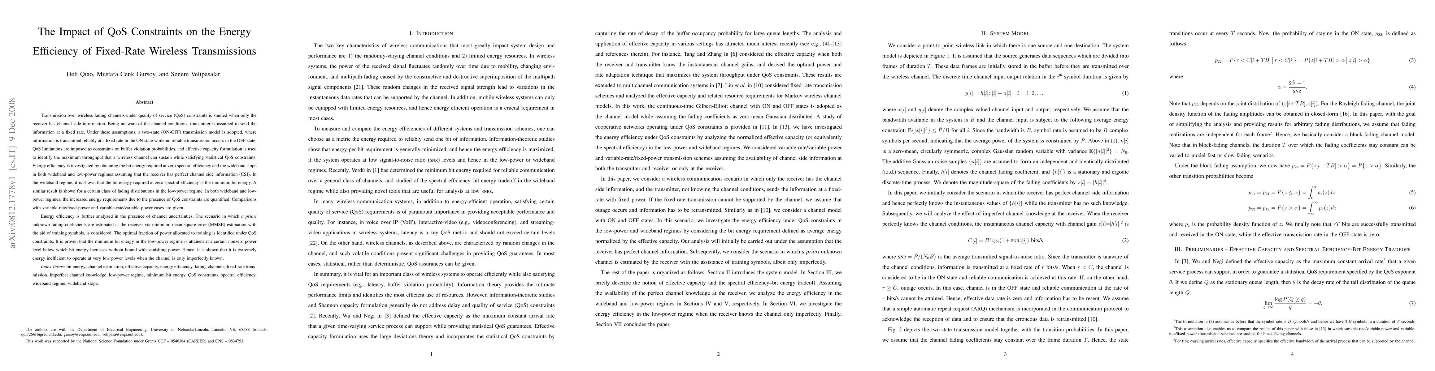 This paper investigates the impact of quality of service (QoS) constraints on the energy efficiency of fixed-rate wireless transmissions under fading channels. It quantifies increased energy requirements due to QoS constraints and compares these with variable-rate schemes, identifying optimal power allocation strategies under such conditions.