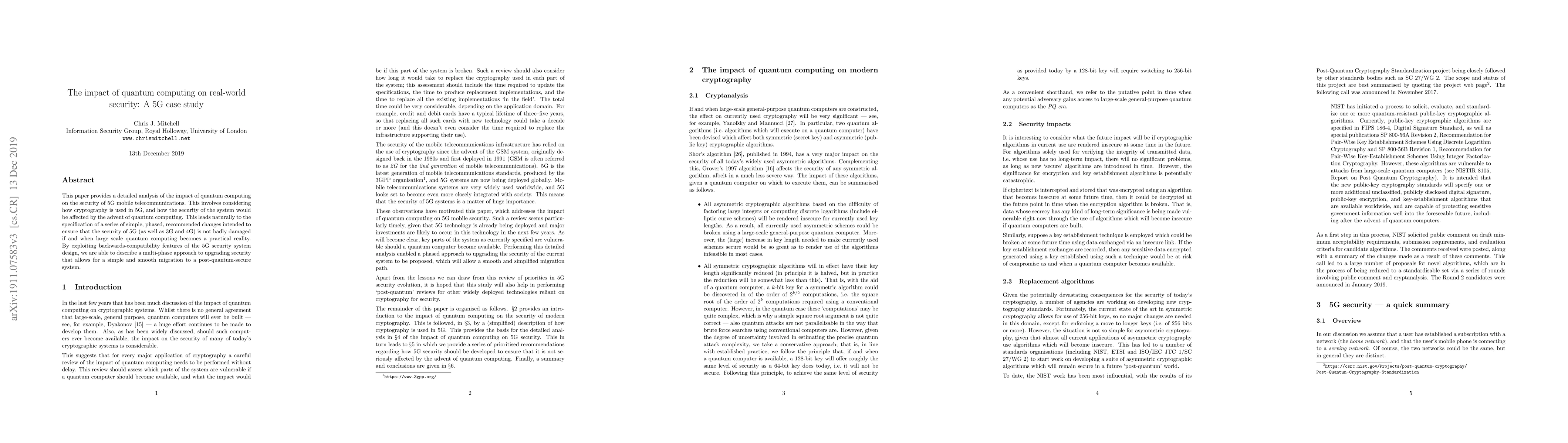 This paper provides a detailed analysis of the impact of quantum computing on the security of 5G mobile telecommunications. This involves considering how cryptography is used in 5G, and how the security of the system would be affected by the advent of quantum computing. This leads naturally to the specification of a series of simple, phased, recommended changes intended to ensure that the security of 5G (as well as 3G and 4G) is not badly damaged if and when large scale quantum computing becomes a practical reality. By exploiting backwards-compatibility features of the 5G security system design, we are able to propose a novel multi-phase approach to upgrading security that allows for a simple and smooth migration to a post-quantum-secure system.
