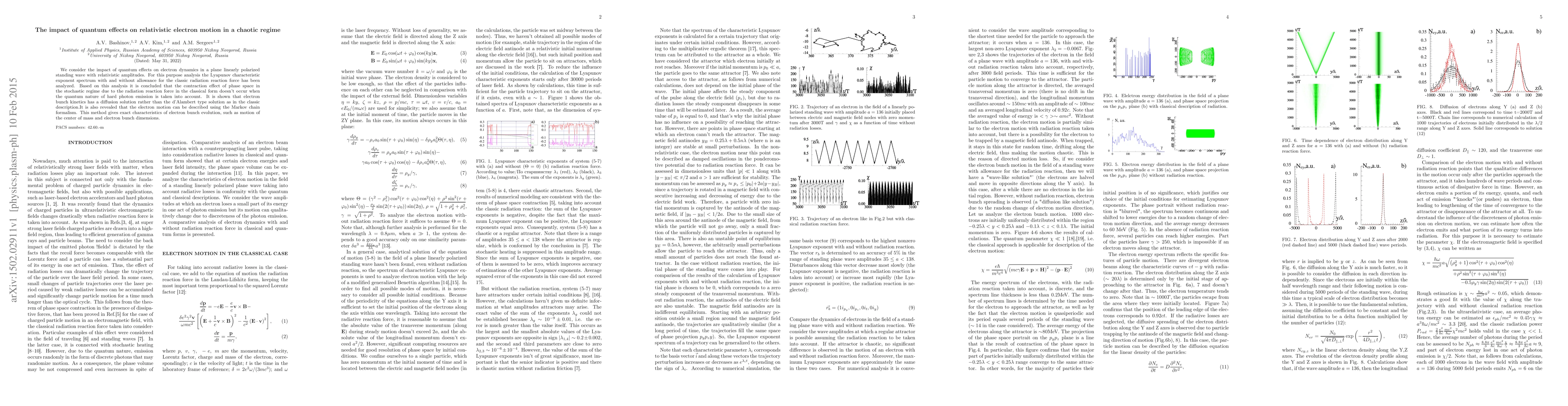 We consider the impact of quantum effects on electron dynamics in a plane linearly polarized standing wave with relativistic amplitudes. For this purpose analysis the Lyapunov characteristic exponent spectrum with and without allowance for the classic radiation reaction force has been analyzed. Based on this analysis it is concluded that the contraction effect of phase space in the stochastic regime due to the radiation reaction force in the classical form doesn't occur when the quantum nature of hard photon emission is taken into account. It is shown that electron bunch kinetics has a diffusion solution rather than the d'Alambert type solution as in the classic description.It is also revealed that the electron motion can be described using the Markov chain formalism. This method gives exact characteristics of electron bunch evolution, such as motion of the center of mass and electron bunch dimensions.