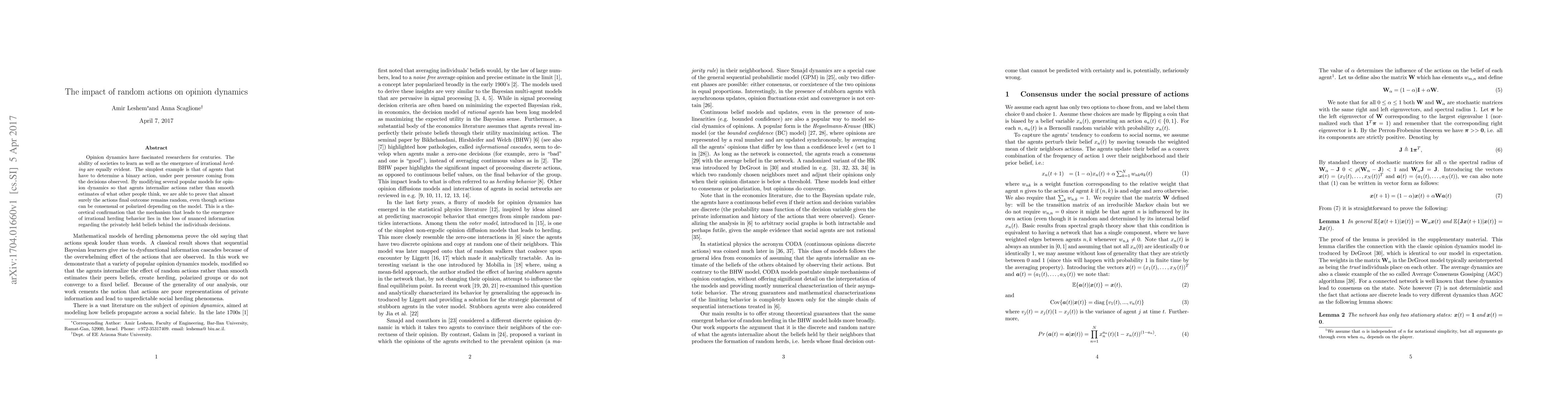 This paper explores how random actions influence opinion dynamics, demonstrating that even consensual or polarized outcomes are likely due to the loss of nuanced private beliefs, confirming the emergence of irrational herding behavior. The study modifies popular opinion models to show that final outcomes remain random despite social influences.