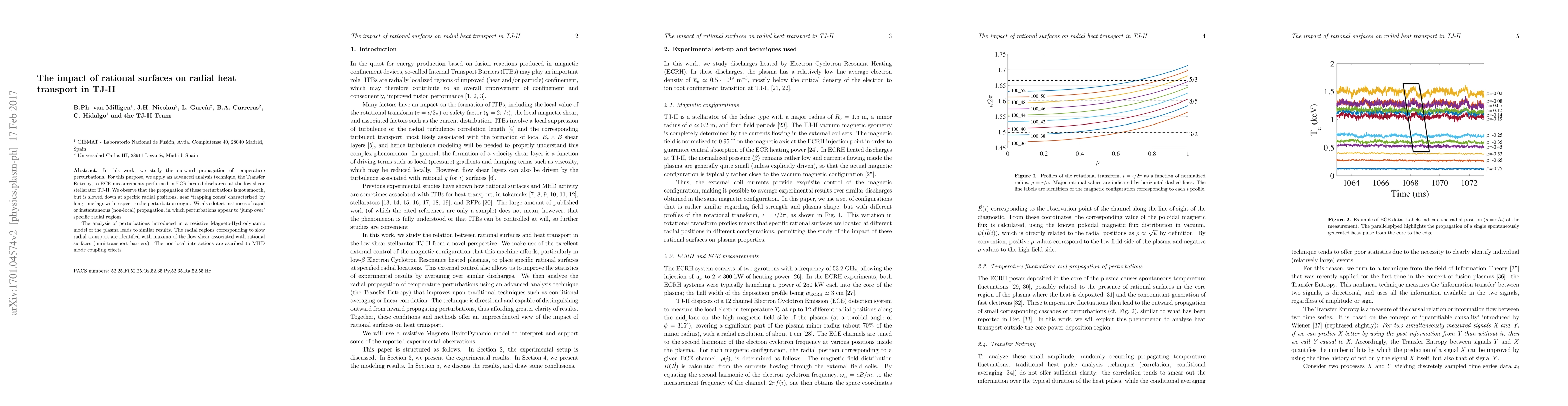 In this work, we study the outward propagation of temperature perturbations. For this purpose, we apply an advanced analysis technique, the Transfer Entropy, to ECE measurements performed in ECR heated discharges at the low-shear stellarator TJ-II. We observe that the propagation of these perturbations is not smooth, but is slowed down at specific radial positions, near 'trapping zones' characterized by long time lags with respect to the perturbation origin. We also detect instances of rapid or instantaneous (non-local) propagation, in which perturbations appear to 'jump over' specific radial regions. The analysis of perturbations introduced in a resistive Magneto-Hydrodynamic model of the plasma leads to similar results. The radial regions corresponding to slow radial transport are identified with maxima of the flow shear associated with rational surfaces (mini-transport barriers). The non-local interactions are ascribed to MHD mode coupling effects.