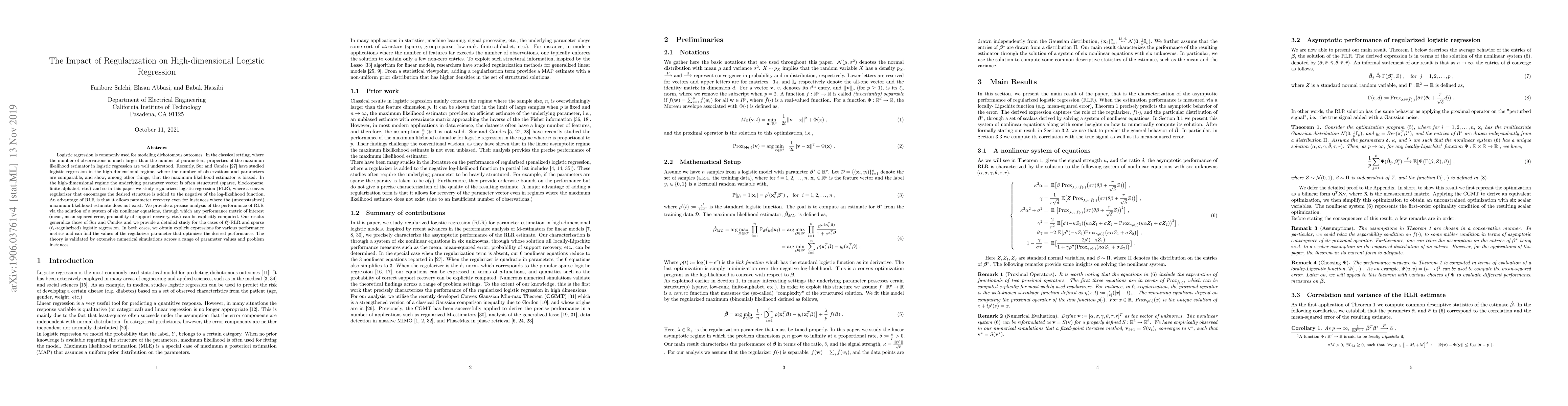 This paper investigates regularized logistic regression (RLR) in high-dimensional settings, where the number of parameters is comparable to the number of observations. The authors provide a detailed analysis of RLR's performance, offering explicit expressions for various metrics and optimal regularizer parameters, validated through extensive numerical simulations.