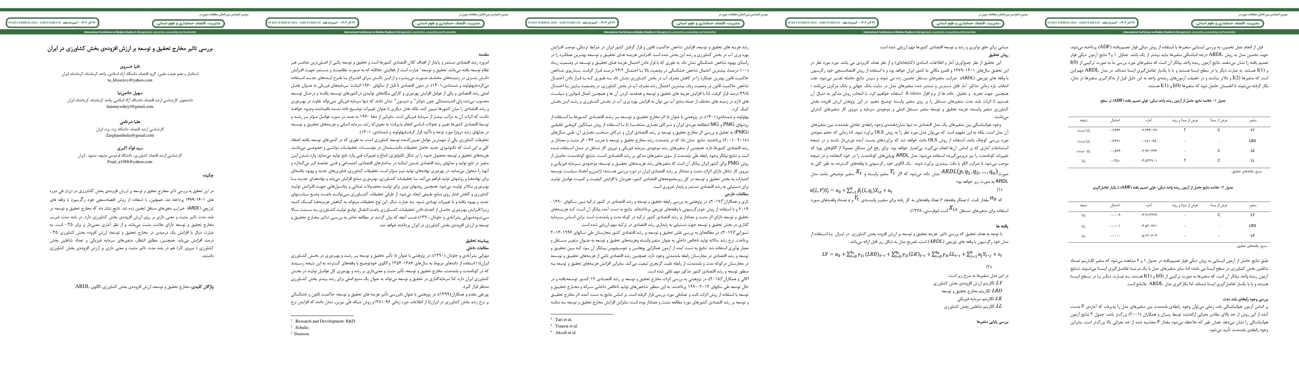 In this study, the impact of research and development (R&D) expenditures on the value added of the agricultural sector in Iran was investigated for the period 1971-2021. For data analysis, the researchers utilized the ARDL econometric model and EViews software. The results indicated that R&D expenditures, both in the short and long run, have a significant positive effect on the value added in the agricultural sector. The estimated elasticity coefficient for R&D expenditures in the short run was 0.45 and in the long run was 0.35, indicating that with a 1 percent increase in research and development expenditures, the value added in the agricultural sector would increase by 0.45 percent in the short run and by 0.35 percent in the long run. Moreover, variables such as capital stock, number of employees in the agricultural sector, and working days also had a significant and positive effect on the value added in the agricultural sector.