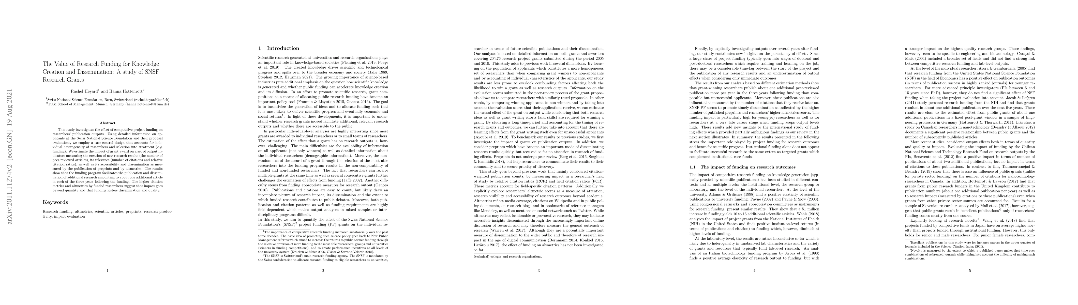 This study examines the effect of competitive project-funding from the Swiss National Science Foundation on researchers' publication outputs, finding that funded researchers publish an additional article per year and achieve higher citation metrics and altmetrics, indicating enhanced research quality and impact.