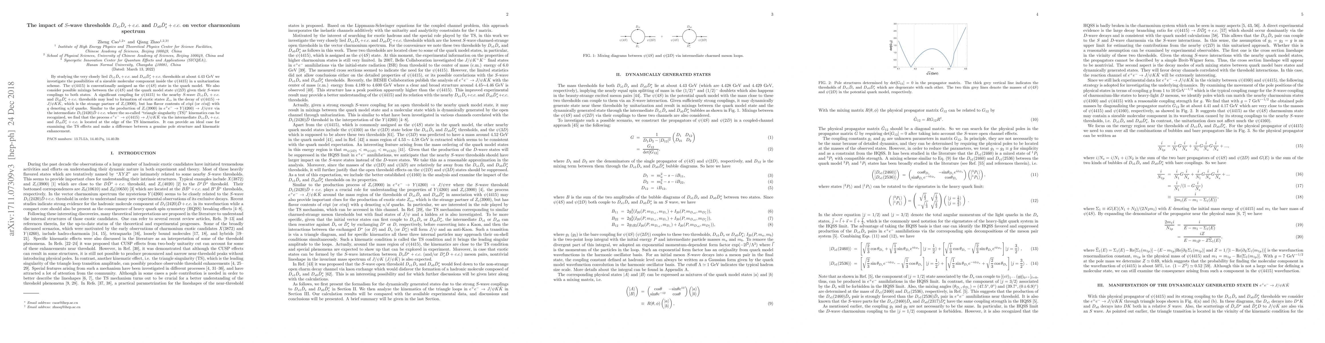 This paper investigates the influence of $S$-wave thresholds $D_{s1}\bar{D}_{s}+c.c.$ and $D_{s0}\bar{D}^*_{s}+c.c.$ on the charmonium spectrum, proposing that $\psi(4415)$ and $\psi(4160)$ are mixing states from these interactions and quark model states. It also explores the production of exotic states $Z_{cs}$ via triangle loop transitions near the "triangle singularity" kinematics, suggesting that cross section lineshapes can reveal this mixing mechanism.