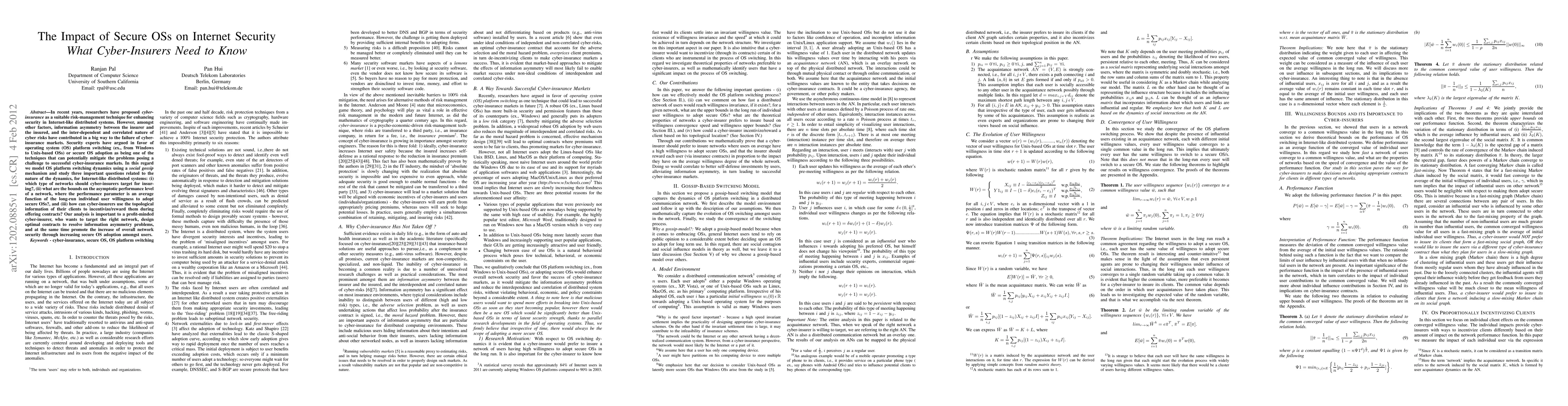 In recent years, researchers have proposed \emph{cyber-insurance} as a suitable risk-management technique for enhancing security in Internet-like distributed systems. However, amongst other factors, information asymmetry between the insurer and the insured, and the inter-dependent and correlated nature of cyber risks have contributed in a big way to the failure of cyber-insurance markets. Security experts have argued in favor of operating system (OS) platform switching (ex., from Windows to Unix-based OSs) or secure OS adoption as being one of the techniques that can potentially mitigate the problems posing a challenge to successful cyber-insurance markets. In this regard we model OS platform switching dynamics using a \emph{social gossip} mechanism and study three important questions related to the nature of the dynamics, for Internet-like distributed systems: (i) which type of networks should cyber-insurers target for insuring?, (ii) what are the bounds on the asymptotic performance level of a network, where the performance parameter is an average function of the long-run individual user willingness to adopt secure OSs?, and (iii) how can cyber-insurers use the topological information of their clients to incentivize/reward them during offering contracts? Our analysis is important to a profit-minded cyber-insurer, who wants to target the right network, design optimal contracts to resolve information asymmetry problems, and at the same time promote the increase of overall network security through increasing secure OS adoption amongst users.
