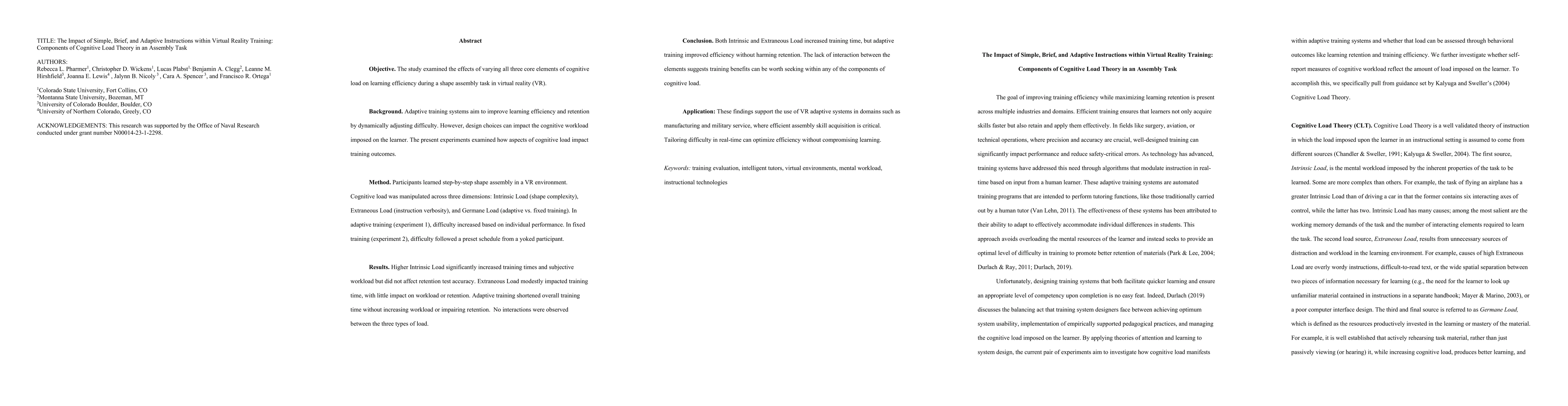 Objective: The study examined the effects of varying all three core elements of cognitive load on learning efficiency during a shape assembly task in virtual reality (VR). Background: Adaptive training systems aim to improve learning efficiency and retention by dynamically adjusting difficulty. However, design choices can impact the cognitive workload imposed on the learner. The present experiments examined how aspects of cognitive load impact training outcomes. Method: Participants learned step-by-step shape assembly in a VR environment. Cognitive load was manipulated across three dimensions: Intrinsic Load (shape complexity), Extraneous Load (instruction verbosity), and Germane Load (adaptive vs. fixed training). In adaptive training (experiment 1), difficulty increased based on individual performance. In fixed training (experiment 2), difficulty followed a preset schedule from a yoked participant. Results: Higher Intrinsic Load significantly increased training times and subjective workload but did not affect retention test accuracy. Extraneous Load modestly impacted training time, with little impact on workload or retention. Adaptive training shortened overall training time without increasing workload or impairing retention. No interactions were observed between the three types of load. Conclusion: Both Intrinsic and Extraneous Load increased training time, but adaptive training improved efficiency without harming retention. The lack of interaction between the elements suggests training benefits can be worth seeking within any of the components of cognitive load. Application: These findings support the use of VR adaptive systems in domains such as manufacturing and military service, where efficient assembly skill acquisition is critical. Tailoring difficulty in real-time can optimize efficiency without compromising learning.