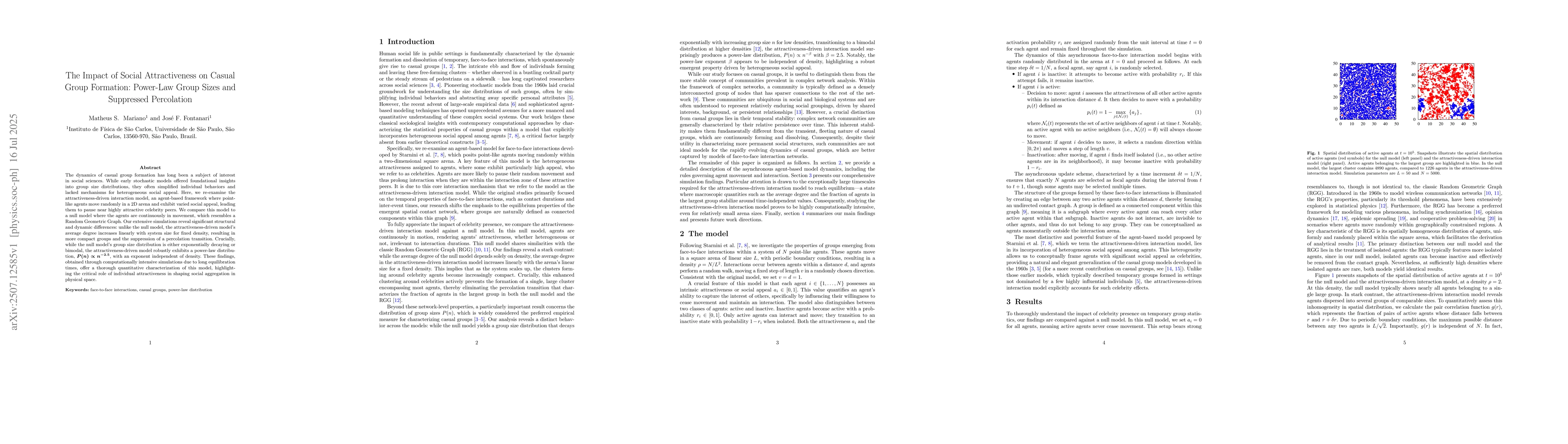 The dynamics of casual group formation has long been a subject of interest in social sciences. While early stochastic models offered foundational insights into group size distributions, they often simplified individual behaviors and lacked mechanisms for heterogeneous social appeal. Here, we re-examine the attractiveness-driven interaction model, an agent-based framework where point-like agents move randomly in a 2D arena and exhibit varied social appeal, leading them to pause near highly attractive celebrity peers. We compare this model to a null model where the agents are continuously in movement, which resembles a Random Geometric Graph. Our extensive simulations reveal significant structural and dynamic differences: unlike the null model, the attractiveness-driven model's average degree increases linearly with system size for fixed density, resulting in more compact groups and the suppression of a percolation transition. Crucially, while the null model's group size distribution is either exponentially decaying or bimodal, the attractiveness-driven model robustly exhibits a power-law distribution, $P(n) \propto n^{-2.5}$, with an exponent independent of density. These findings, obtained through computationally intensive simulations due to long equilibration times, offer a thorough quantitative characterization of this model, highlighting the critical role of individual attractiveness in shaping social aggregation in physical space.
