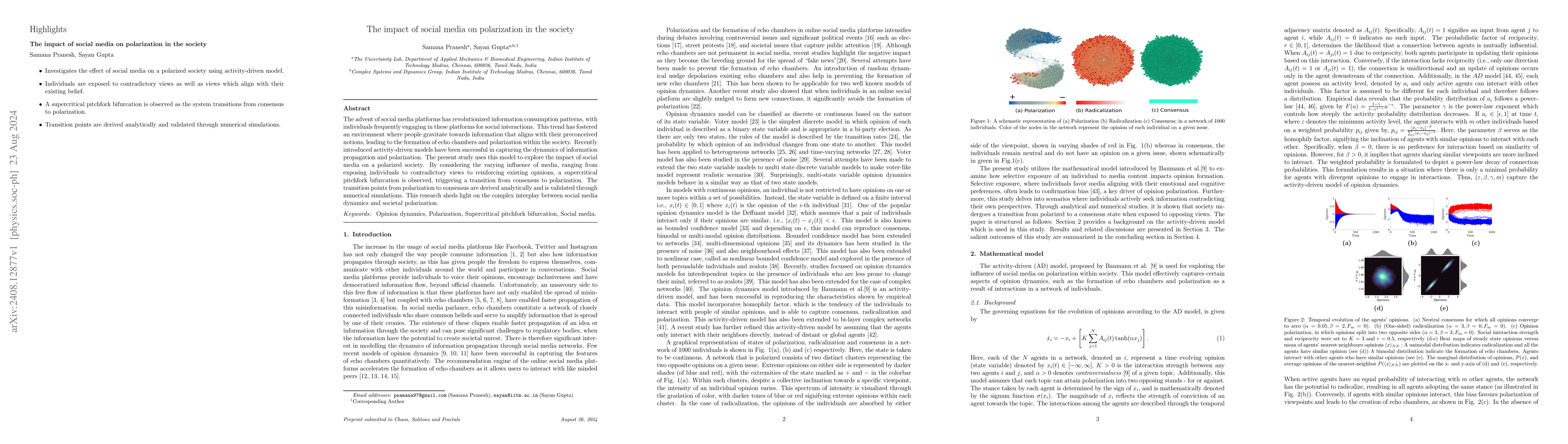 The advent of social media platforms has revolutionized information consumption patterns, with individuals frequently engaging in these platforms for social interactions. This trend has fostered an environment where people gravitate towards information that aligns with their preconceived notions, leading to the formation of echo chambers and polarization within the society. Recently introduced activity-driven models have been successful in capturing the dynamics of information propagation and polarization. The present study uses this model to explore the impact of social media on a polarized society. By considering the varying influence of media, ranging from exposing individuals to contradictory views to reinforcing existing opinions, a supercritical pitchfork bifurcation is observed, triggering a transition from consensus to polarization. The transition points from polarization to consensus are derived analytically and is validated through numerical simulations. This research sheds light on the complex interplay between social media dynamics and societal polarization.