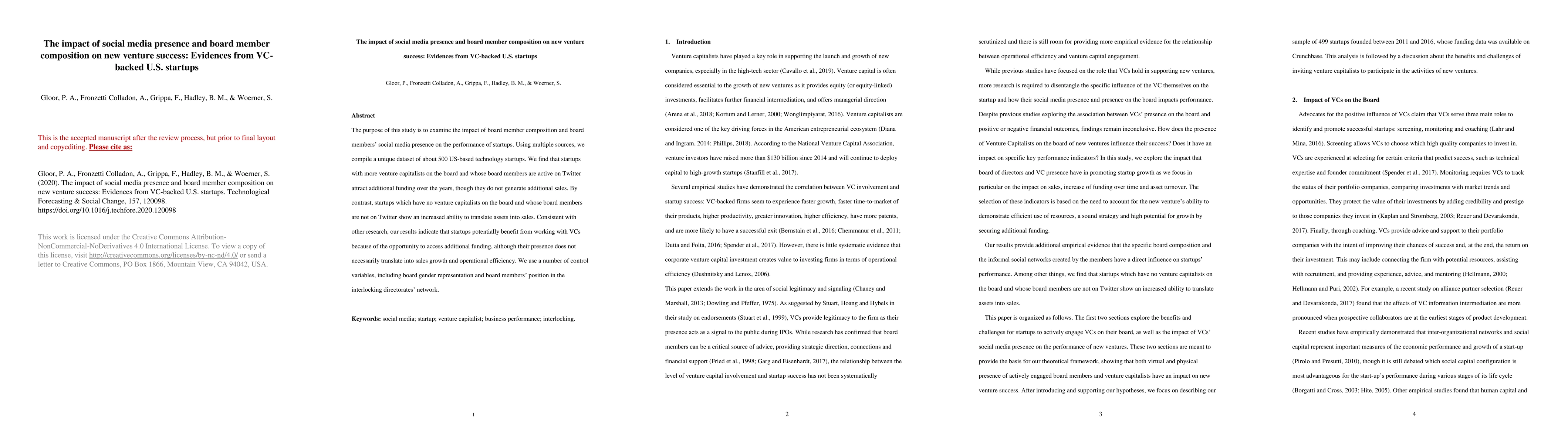 This study of 500 US tech startups reveals that VC-heavy boards and active Twitter board members attract more funding but not sales. Conversely, VC-free boards with inactive Twitter members excel in sales conversion. VC involvement aids funding, not guaranteed sales growth.