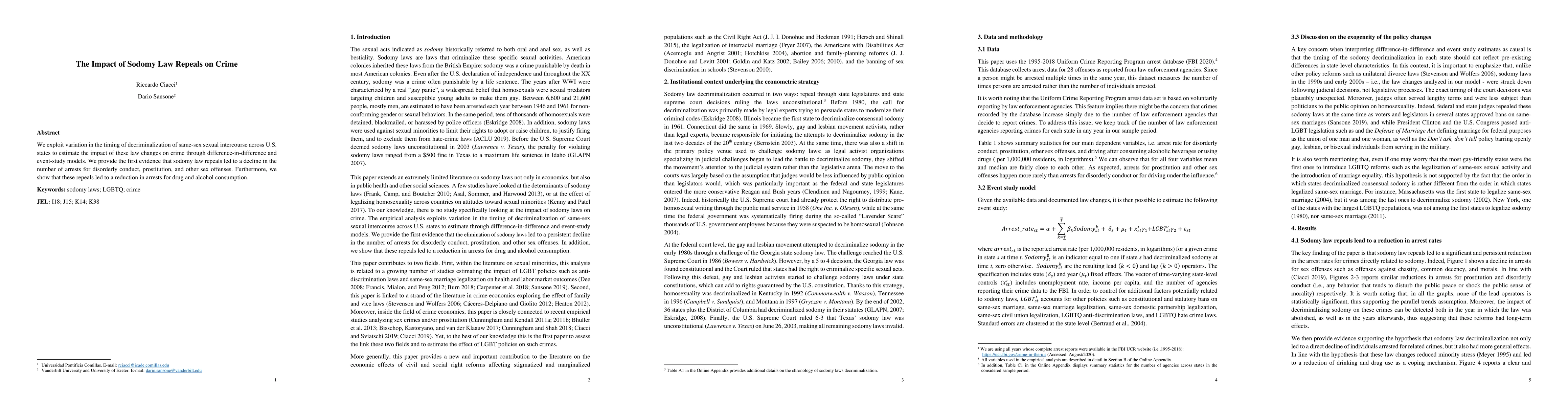 We exploit variation in the timing of decriminalization of same-sex sexual intercourse across U.S. states to estimate the impact of these law changes on crime through difference-in-difference and event-study models. We provide the first evidence that sodomy law repeals led to a decline in the number of arrests for disorderly conduct, prostitution, and other sex offenses. Furthermore, we show that these repeals led to a reduction in arrests for drug and alcohol consumption.