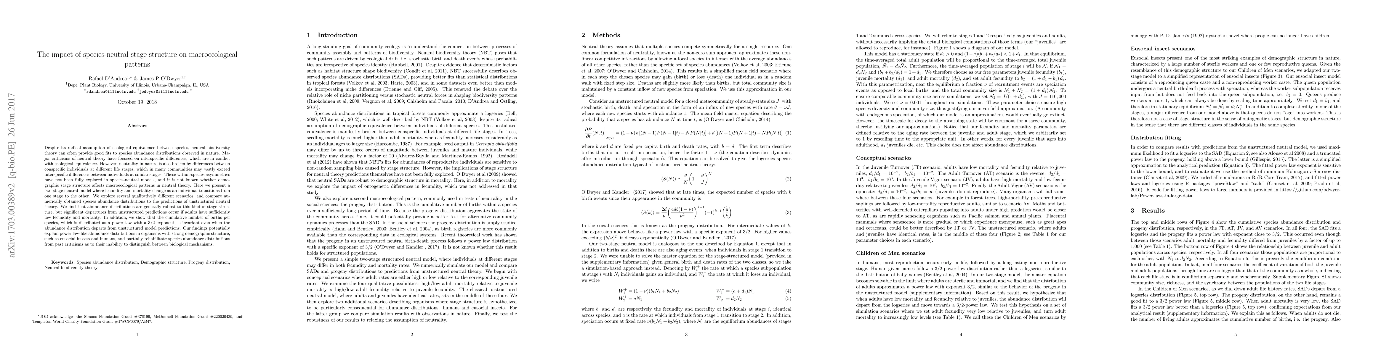 This paper investigates how species-neutral stage structure impacts macroecological patterns, finding that while species abundance distributions remain robust, significant deviations occur when adult fecundity and mortality are low. It also reveals that the cumulative number of births per species follows a power law, potentially explaining such patterns in organisms with strong demographic structures.