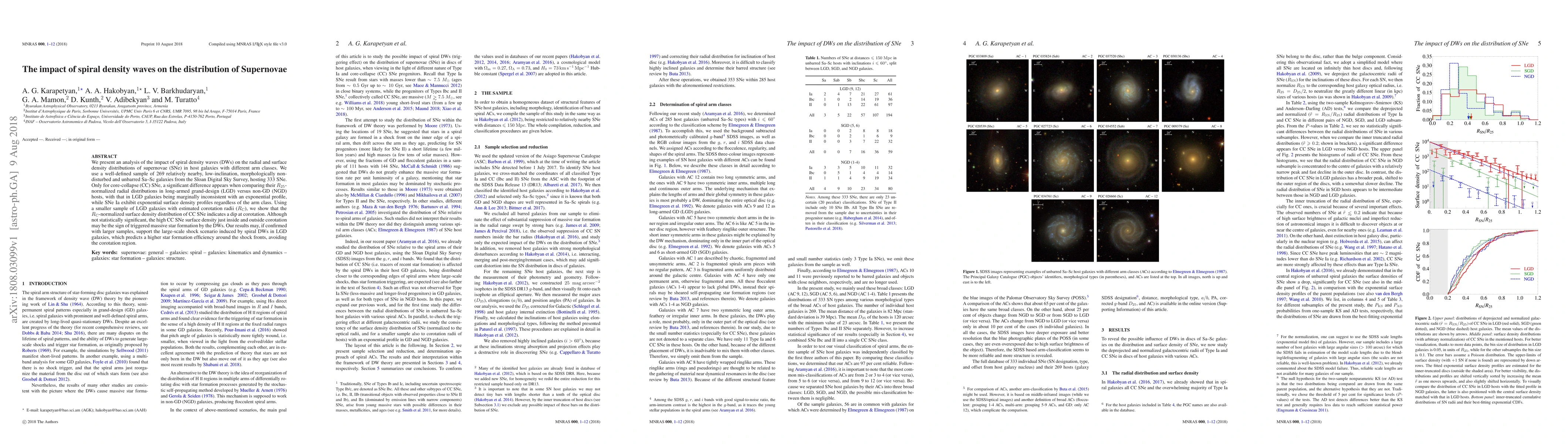 This study analyzes the influence of spiral density waves on the distribution of supernovae in Sa-Sc galaxies, revealing that core-collapse supernovae show different radial and surface density distributions in grand-design versus non-grand-design galaxies, potentially indicating triggered star formation by density waves. Supernovae Ia maintain exponential profiles regardless of the arm class.