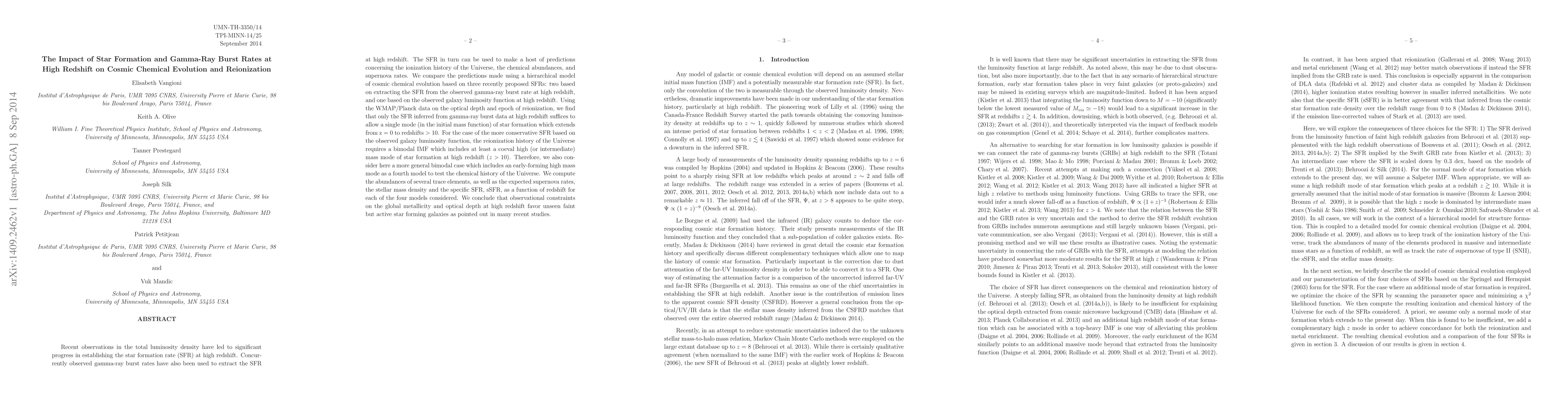 Recent observations in the total luminosity density have led to significant progress in establishing the star formation rate (SFR) at high redshift. Concurrently observed gamma-ray burst rates have also been used to extract the SFR at high redshift. The SFR in turn can be used to make a host of predictions concerning the ionization history of the Universe, the chemical abundances, and supernova rates. We compare the predictions made using a hierarchical model of cosmic chemical evolution based on three recently proposed SFRs: two based on extracting the SFR from the observed gamma-ray burst rate at high redshift, and one based on the observed galaxy luminosity function at high redshift. Using the WMAP/Planck data on the optical depth and epoch of reionization, we find that only the SFR inferred from gamma-ray burst data at high redshift suffices to allow a single mode (in the initial mass function) of star formation which extends from z = 0 to redshifts > 10. For the case of the more conservative SFR based on the observed galaxy luminosity function, the reionization history of the Universe requires a bimodal IMF which includes at least a coeval high (or intermediate) mass mode of star formation at high redshift (z> 10). Therefore, we also consider here a more general bimodal case which includes an early-forming high mass mode as a fourth model to test the chemical history of the Universe. We compute the abundances of several trace elements, as well as the expected supernova rates, the stellar mass density and the specific SFR, sSFR, as a function of redshift for each of the four models considered. We conclude that observational constraints on the global metallicity and optical depth at high redshift favor unseen faint but active star forming galaxies as pointed out in many recent studies.
