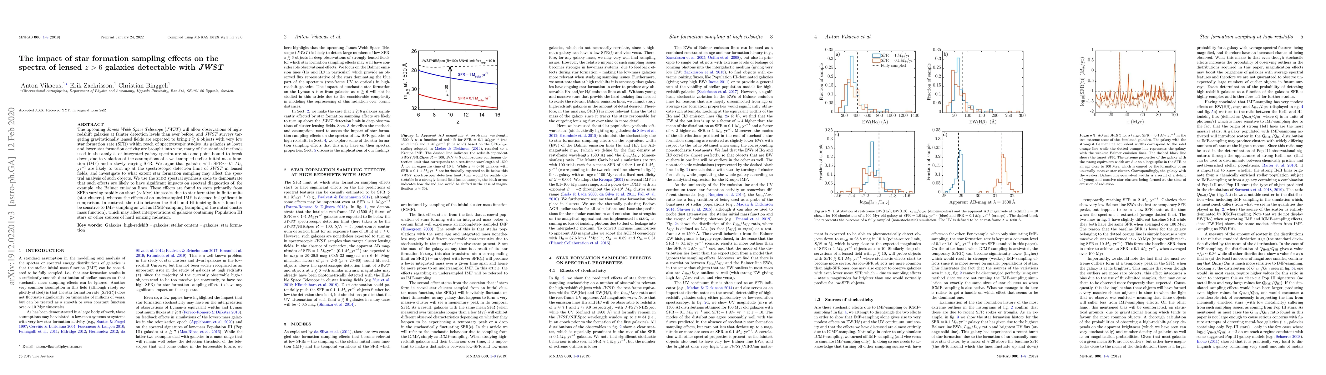This paper investigates how star formation sampling affects the spectra of lensed $z>6$ galaxies detectable with the JWST, finding that low star formation rates (SFR) lead to significant impacts on spectral diagnostics, particularly in the Balmer emission lines. The study concludes that rapid SFR variations due to star clusters are the main culprits, while undersampled stellar initial mass function effects are less significant.