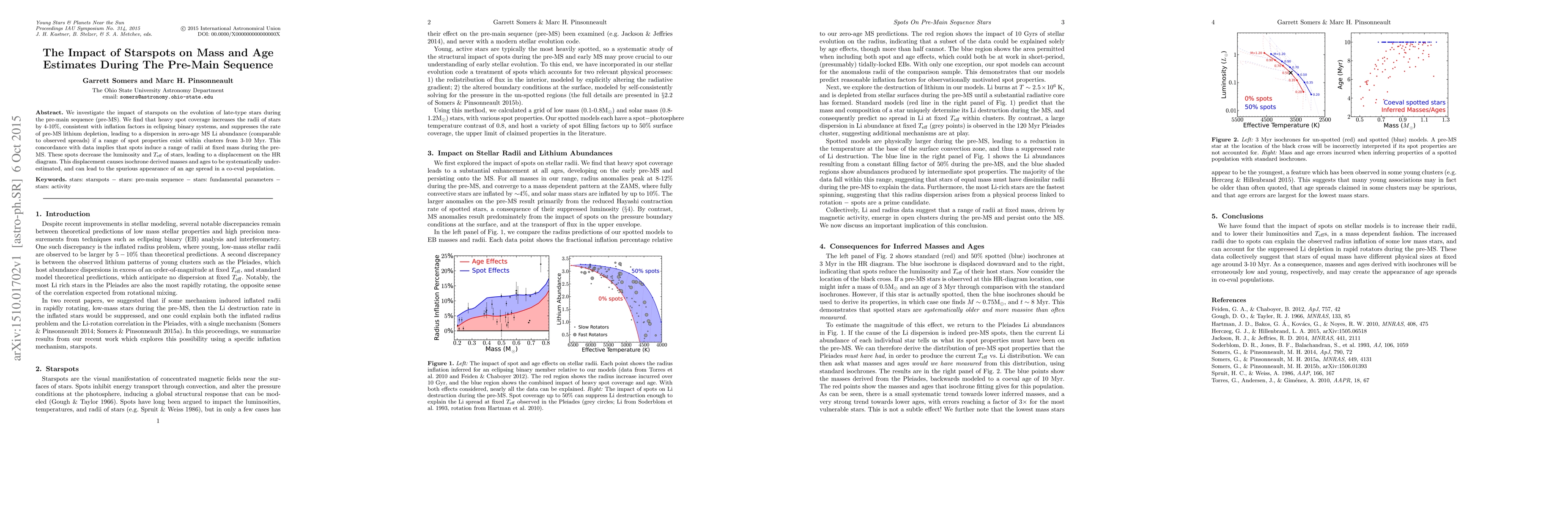 We investigate the impact of starspots on the evolution of late-type stars during the pre-main sequence (pre-MS). We find that heavy spot coverage increases the radii of stars by 4-10%, consistent with inflation factors in eclipsing binary systems, and suppresses the rate of pre-MS lithium depletion, leading to a dispersion in zero-age MS Li abundance (comparable to observed spreads) if a range of spot properties exist within clusters from 3-10 Myr. This concordance with data implies that spots induce a range of radii at fixed mass during the pre-MS. These spots decrease the luminosity and $T_{\rm eff}$ of stars, leading to a displacement on the HR diagram. This displacement causes isochrone derived masses and ages to be systematically under-estimated, and can lead to the spurious appearance of an age spread in a co-eval population.