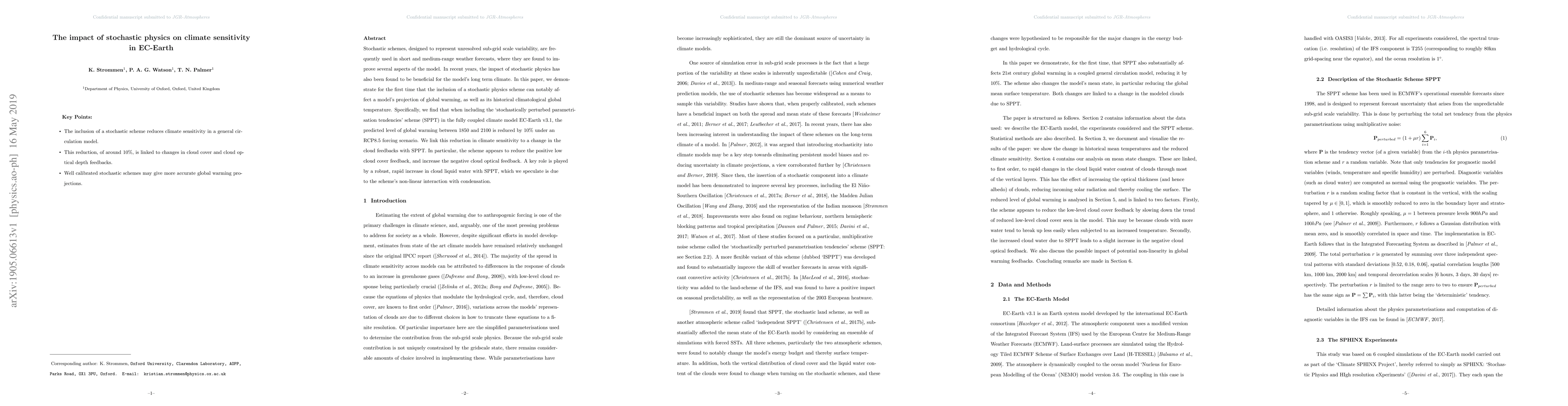 The inclusion of stochastic physics in climate model EC-Earth v3.1 reduces predicted global warming by 10% under a forcing scenario, with changes attributed to altered cloud feedbacks.