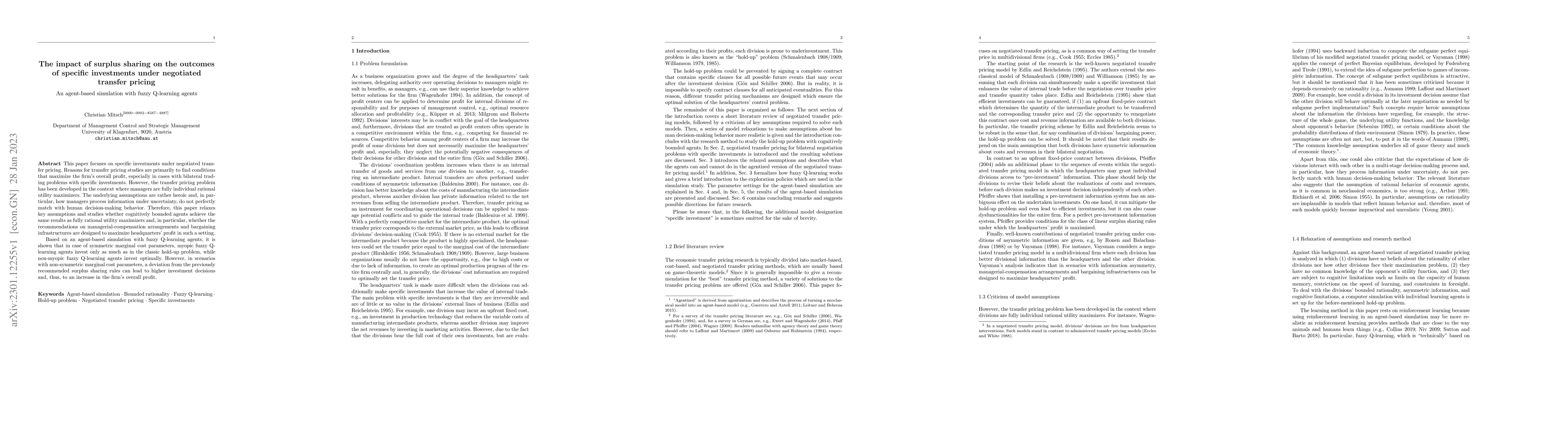 This paper investigates specific investments under negotiated transfer pricing using agent-based simulations with fuzzy Q-learning agents, finding that non-myopic agents achieve optimal investment, while deviations from traditional surplus sharing rules can enhance overall firm profits in asymmetric scenarios.