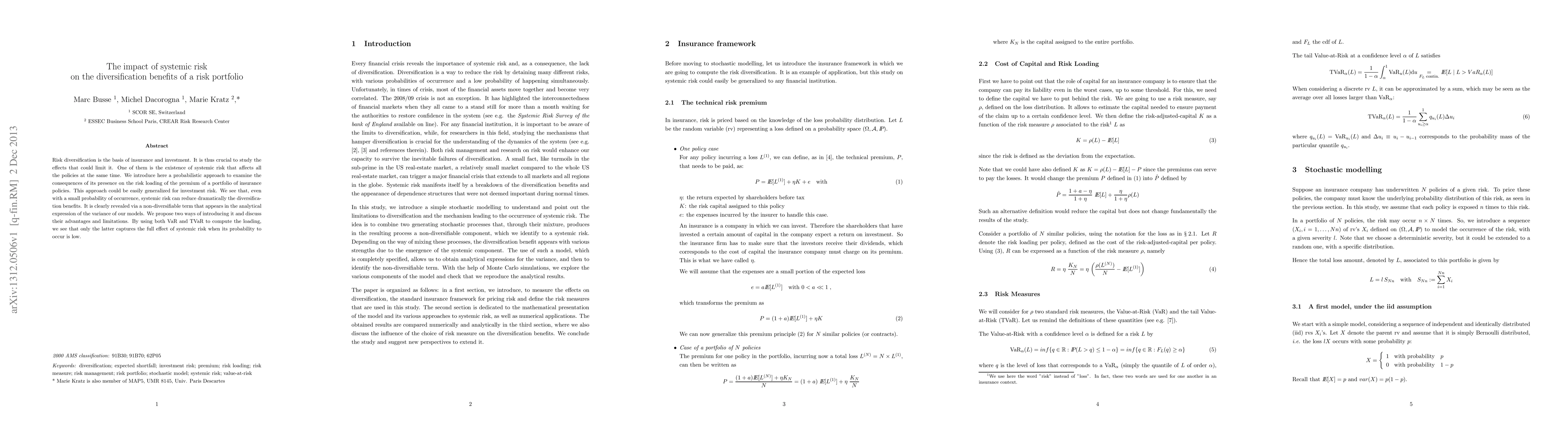 Risk diversification is the basis of insurance and investment. It is thus crucial to study the effects that could limit it. One of them is the existence of systemic risk that affects all the policies at the same time. We introduce here a probabilistic approach to examine the consequences of its presence on the risk loading of the premium of a portfolio of insurance policies. This approach could be easily generalized for investment risk. We see that, even with a small probability of occurrence, systemic risk can reduce dramatically the diversification benefits. It is clearly revealed via a non-diversifiable term that appears in the analytical expression of the variance of our models. We propose two ways of introducing it and discuss their advantages and limitations. By using both VaR and TVaR to compute the loading, we see that only the latter captures the full effect of systemic risk when its probability to occur is low
