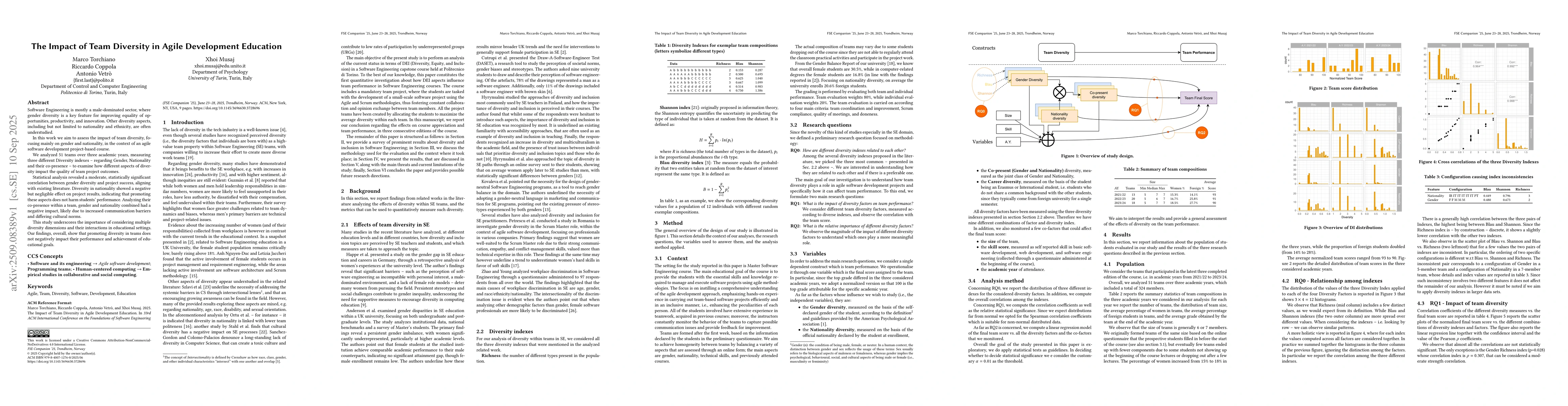 Software Engineering is mostly a male-dominated sector, where gender diversity is a key feature for improving equality of opportunities, productivity, and innovation. Other diversity aspects, including but not limited to nationality and ethnicity, are often understudied.In this work we aim to assess the impact of team diversity, focusing mainly on gender and nationality, in the context of an agile software development project-based course. We analyzed 51 teams over three academic years, measuring three different Diversity indexes - regarding Gender, Nationality and their co-presence - to examine how different aspects of diversity impact the quality of team project outcomes.Statistical analysis revealed a moderate, statistically significant correlation between gender diversity and project success, aligning with existing literature. Diversity in nationality showed a negative but negligible effect on project results, indicating that promoting these aspects does not harm students' performance. Analyzing their co-presence within a team, gender and nationality combined had a negative impact, likely due to increased communication barriers and differing cultural norms.This study underscores the importance of considering multiple diversity dimensions and their interactions in educational settings. Our findings, overall, show that promoting diversity in teams does not negatively impact their performance and achievement of educational goals.