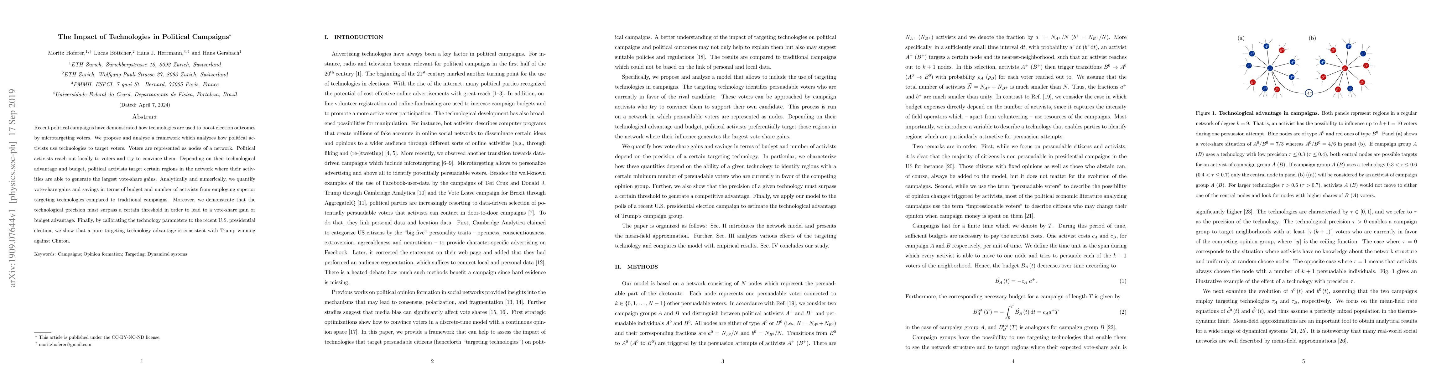 This paper proposes a framework to analyze the impact of technologies in political campaigns, showing how activists use superior targeting to maximize vote-share gains. It finds that technological precision must exceed a threshold for effectiveness, and calibrates its model to the 2016 U.S. election, suggesting Trump's victory could be attributed to such technological advantages.