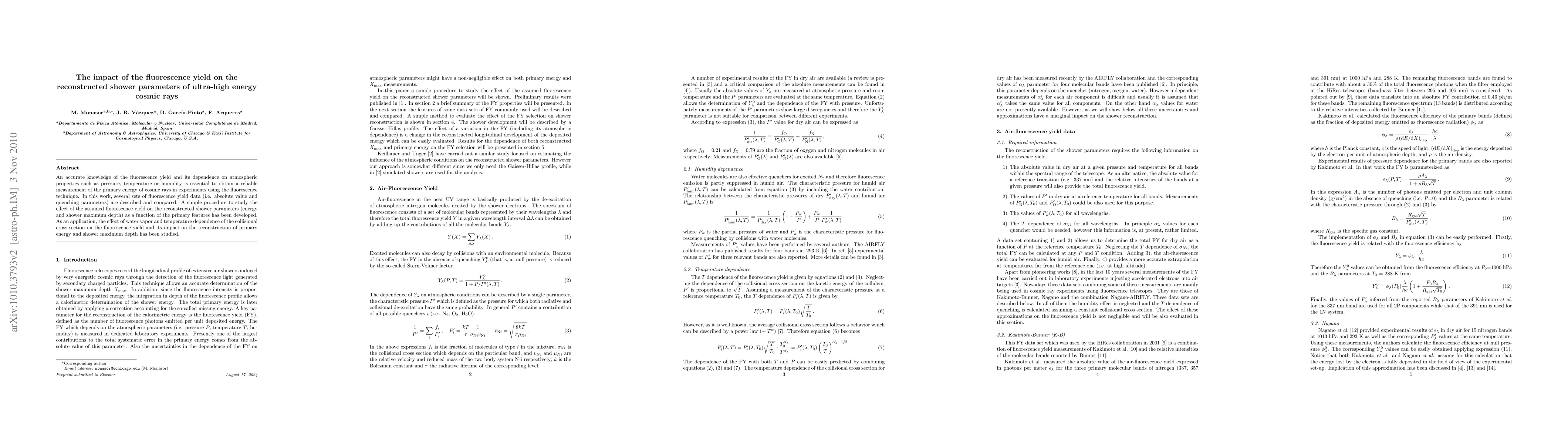 An accurate knowledge of the fluorescence yield and its dependence on atmospheric properties such as pressure, temperature or humidity is essential to obtain a reliable measurement of the primary energy of cosmic rays in experiments using the fluorescence technique. In this work, several sets of fluorescence yield data (i.e. absolute value and quenching parameters) are described and compared. A simple procedure to study the effect of the assumed fluorescence yield on the reconstructed shower parameters (energy and shower maximum depth) as a function of the primary features has been developed. As an application, the effect of water vapor and temperature dependence of the collisional cross section on the fluorescence yield and its impact on the reconstruction of primary energy and shower maximum depth has been studied.
