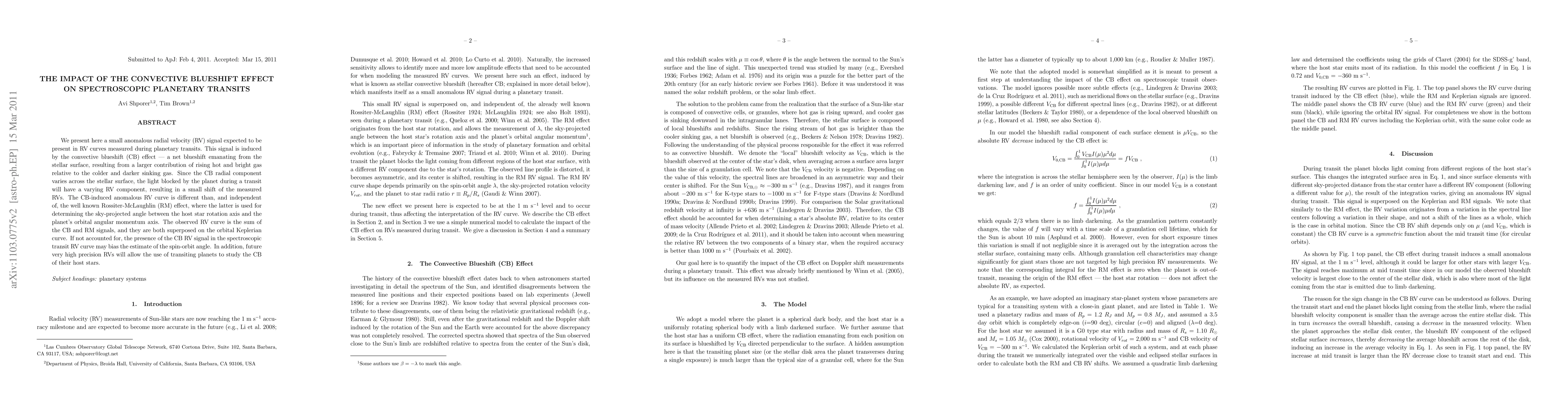 We present here a small anomalous radial velocity (RV) signal expected to be present in RV curves measured during planetary transits. This signal is induced by the convective blueshift (CB) effect --- a net blueshift emanating from the stellar surface, resulting from a larger contribution of rising hot and bright gas relative to the colder and darker sinking gas. Since the CB radial component varies across the stellar surface, the light blocked by the planet during a transit will have a varying RV component, resulting in a small shift of the measured RVs. The CB-induced anomalous RV curve is different than, and independent of, the well known Rossiter-McLaughlin (RM) effect, where the latter is used for determining the sky-projected angle between the host star rotation axis and the planet's orbital angular momentum axis. The observed RV curve is the sum of the CB and RM signals, and they are both superposed on the orbital Keplerian curve. If not accounted for, the presence of the CB RV signal in the spectroscopic transit RV curve may bias the estimate of the spin-orbit angle. In addition, future very high precision RVs will allow the use of transiting planets to study the CB of their host stars.