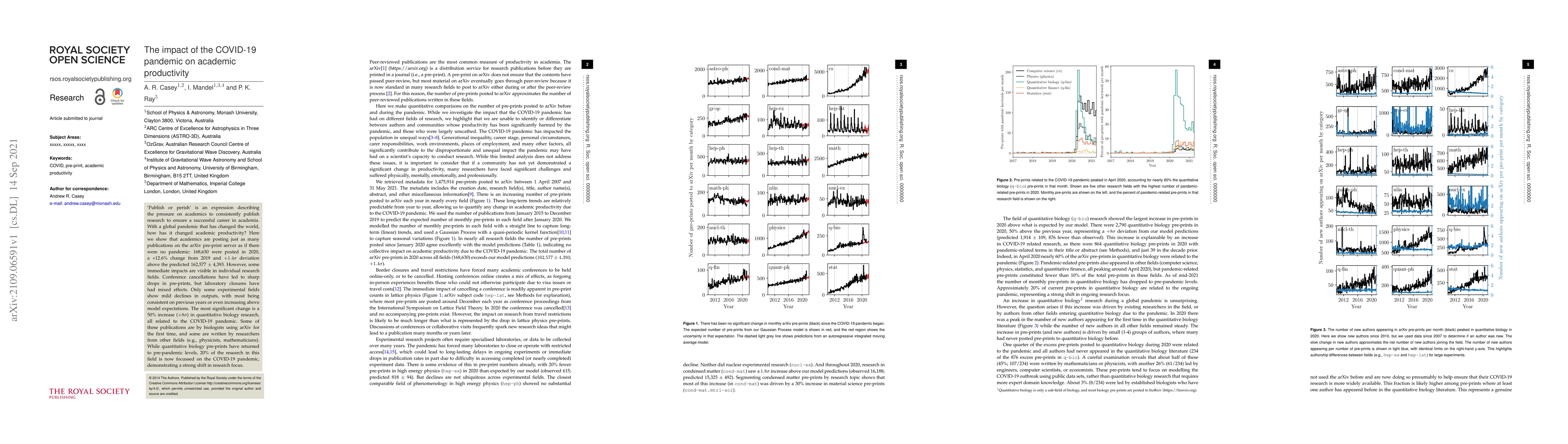 The COVID-19 pandemic has led to a 12.6% increase in academic publications on arXiv in 2020, with a notable 50% surge in quantitative biology research focused on the pandemic. Despite conference cancellations and laboratory closures, most fields have maintained or even increased their output.