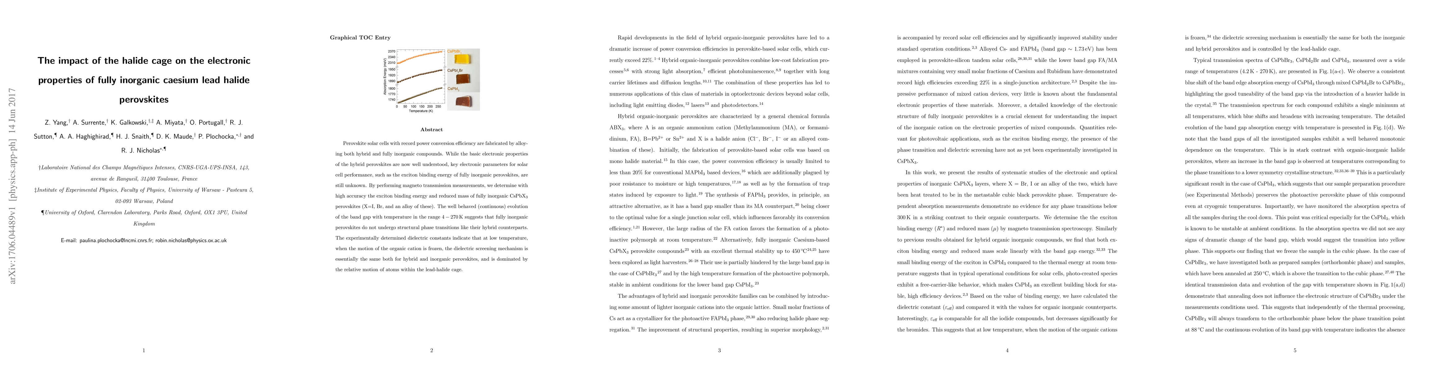 Perovskite solar cells with record power conversion efficiency are fabricated by alloying both hybrid and fully inorganic compounds. While the basic electronic properties of the hybrid perovskites are now well understood, key electronic parameters for solar cell performance, such as the exciton binding energy of fully inorganic perovskites, are still unknown. By performing magneto transmission measurements, we determine with high accuracy the exciton binding energy and reduced mass of fully inorganic CsPbX$_3$ perovskites (X=I, Br, and an alloy of these). The well behaved (continuous) evolution of the band gap with temperature in the range $4-270$\,K suggests that fully inorganic perovskites do not undergo structural phase transitions like their hybrid counterparts. The experimentally determined dielectric constants indicate that at low temperature, when the motion of the organic cation is frozen, the dielectric screening mechanism is essentially the same both for hybrid and inorganic perovskites, and is dominated by the relative motion of atoms within the lead-halide cage.