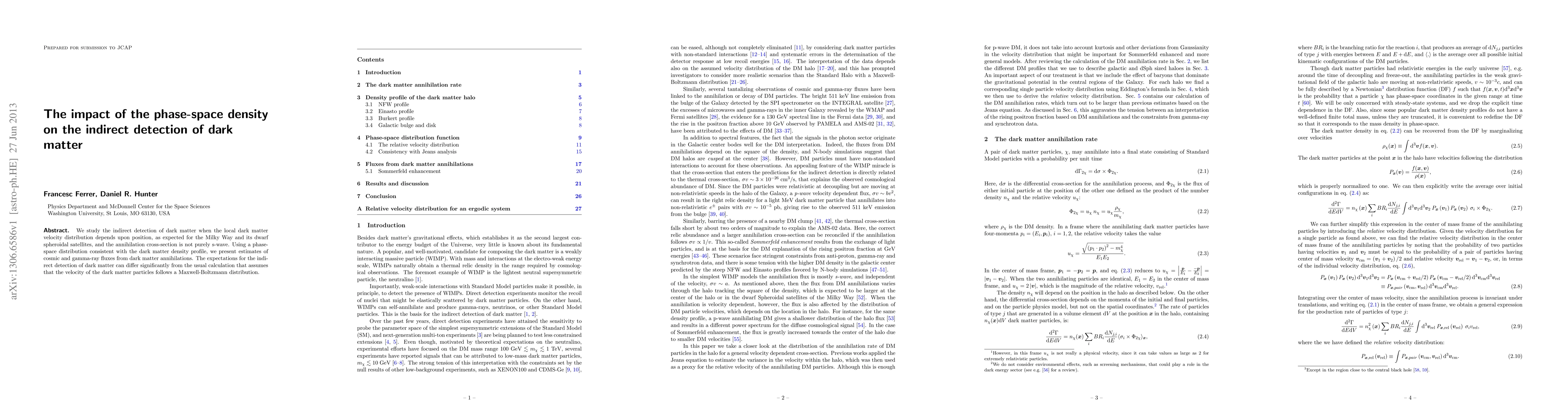 We study the indirect detection of dark matter when the local dark matter velocity distribution depends upon position, as expected for the Milky Way and its dwarf spheroidal satellites, and the annihilation cross-section is not purely s-wave. Using a phase-space distribution consistent with the dark matter density profile, we present estimates of cosmic and gamma-ray fluxes from dark matter annihilations. The expectations for the indirect detection of dark matter can differ significantly from the usual calculation that assumes that the velocity of the dark matter particles follows a Maxwell-Boltzmann distribution.