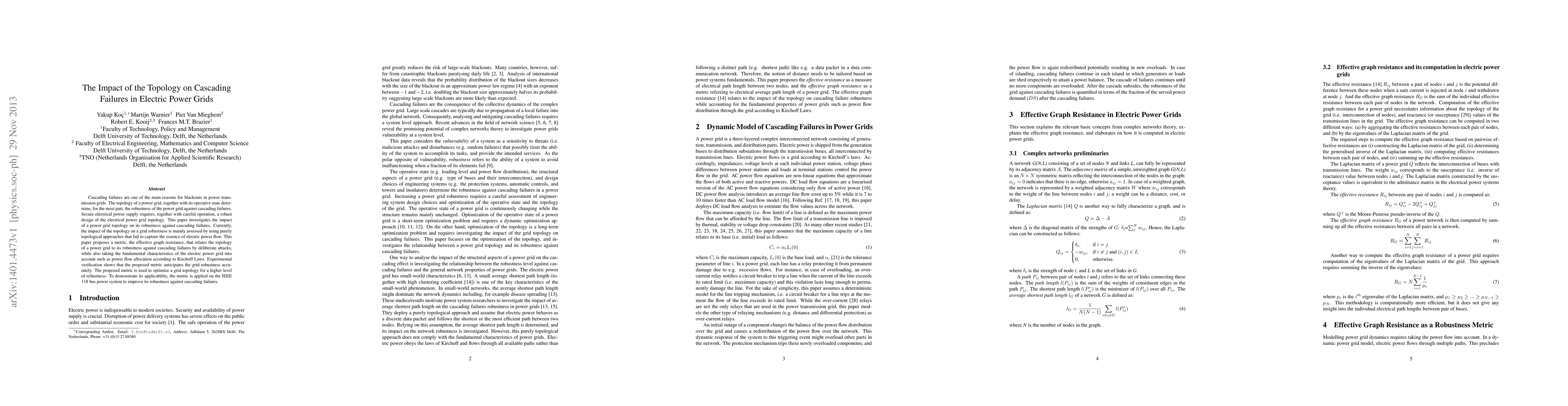 This paper proposes a new metric, effective graph resistance, to assess the impact of power grid topology on robustness against cascading failures, incorporating power flow characteristics. Experimental results show the metric accurately predicts grid robustness and is used to optimize the IEEE 118 bus system for enhanced resilience.