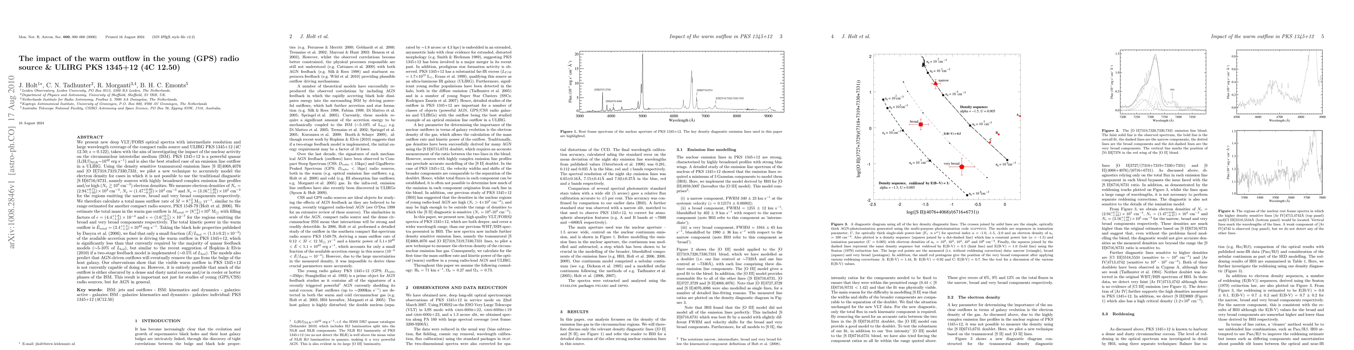 (Abridged) We present new deep VLT/FORS optical spectra with intermediate resolution and large wavelength coverage of the GPS radio source and ULIRG PKS1345+12 (4C12.50; z=0.122), taken with the aim of investigating the impact of the nuclear activity on the circumnuclear ISM. PKS1345+12 is a powerful quasar and is also the best studied case of an emission line outflow in a ULIRG. Using the density sensitive transauroral emission lines [S II]4068,4076 and [O II]7318,7319,7330,7331, we pilot a new technique to accurately model the electron density for cases in which it is not possible to use the traditional diagnostic [S II]6716/6731, namely sources with highly broadened complex emission line profiles and/or high (Ne > 10^4 cm^-3) electron densities. We measure electron densities of Ne=2.94x10^3 cm^-3, Ne=1.47x10^4 cm^-3 and Ne=3.16x10^5 cm^-3 for the regions emitting the narrow, broad and very broad components respectively. We calculate a total mass outflow rate of 8 M_sun yr^-1. We estimate the total mass in the warm gas outflow is 8x10^5 M_sun. The total kinetic power in the warm outflow is 3.4x10^42 erg s^-1. We find that only a small fraction (0.13% of Lbol) of the available accretion power is driving the warm outflow, significantly less than currently required by the majority of quasar feedback models (~5-10\% of Lbol), but similar to recent findings by Hopkins et al. (2010) for a two-stage feedback model. The models also predict that AGN outflows will eventually remove the gas from the bulge of the host galaxy. The visible warm outflow in PKS1345+12 is not currently capable of doing so. However, it is entirely possible that much of the outflow is either obscured by a dense and dusty natal cocoon and/or in cooler or hotter phases of the ISM. This result is important not just for studies of young (GPS/CSS) radio sources, but for AGN in general.