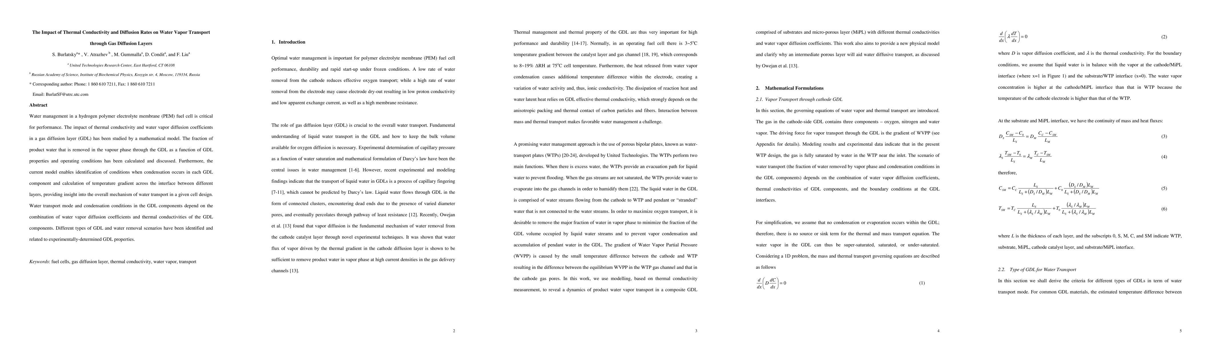 Water management in a hydrogen polymer electrolyte membrane (PEM) fuel cell is critical for performance. The impact of thermal conductivity and water vapor diffusion coefficients in a gas diffusion layer (GDL) has been studied by a mathematical model. The fraction of product water that is removed in the vapour phase through the GDL as a function of GDL properties and operating conditions has been calculated and discussed. Furthermore, the current model enables identification of conditions when condensation occurs in each GDL component and calculation of temperature gradient across the interface between different layers, providing insight into the overall mechanism of water transport in a given cell design. Water transport mode and condensation conditions in the GDL components depend on the combination of water vapor diffusion coefficients and thermal conductivities of the GDL components. Different types of GDL and water removal scenarios have been identified and related to experimentally-determined GDL properties.
