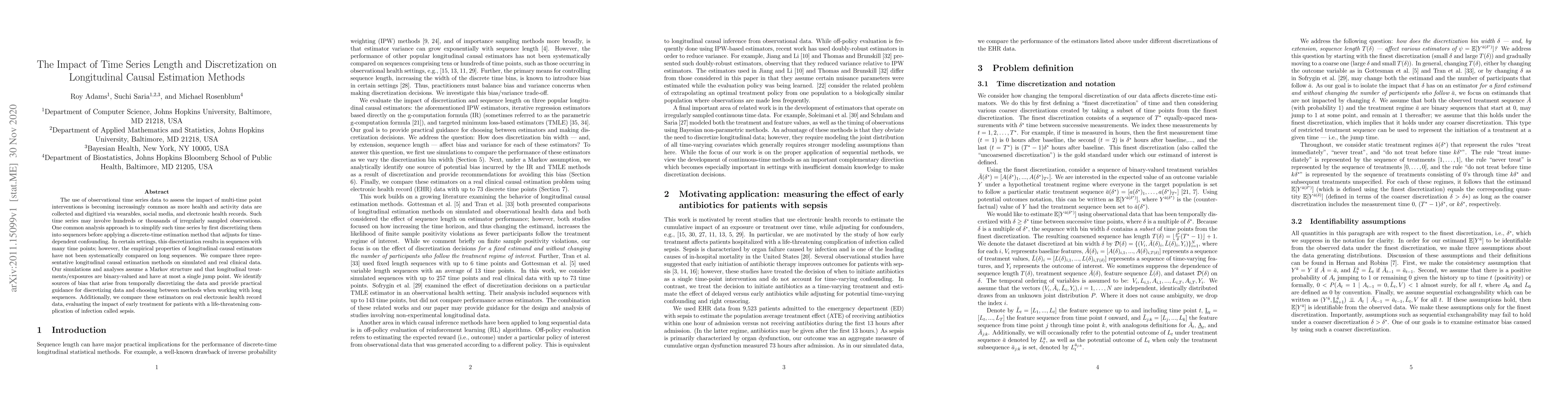 The use of observational time series data to assess the impact of multi-time point interventions is becoming increasingly common as more health and activity data are collected and digitized via wearables, social media, and electronic health records. Such time series may involve hundreds or thousands of irregularly sampled observations. One common analysis approach is to simplify such time series by first discretizing them into sequences before applying a discrete-time estimation method that adjusts for time-dependent confounding. In certain settings, this discretization results in sequences with many time points; however, the empirical properties of longitudinal causal estimators have not been systematically compared on long sequences. We compare three representative longitudinal causal estimation methods on simulated and real clinical data. Our simulations and analyses assume a Markov structure and that longitudinal treatments/exposures are binary-valued and have at most a single jump point. We identify sources of bias that arise from temporally discretizing the data and provide practical guidance for discretizing data and choosing between methods when working with long sequences. Additionally, we compare these estimators on real electronic health record data, evaluating the impact of early treatment for patients with a life-threatening complication of infection called sepsis.