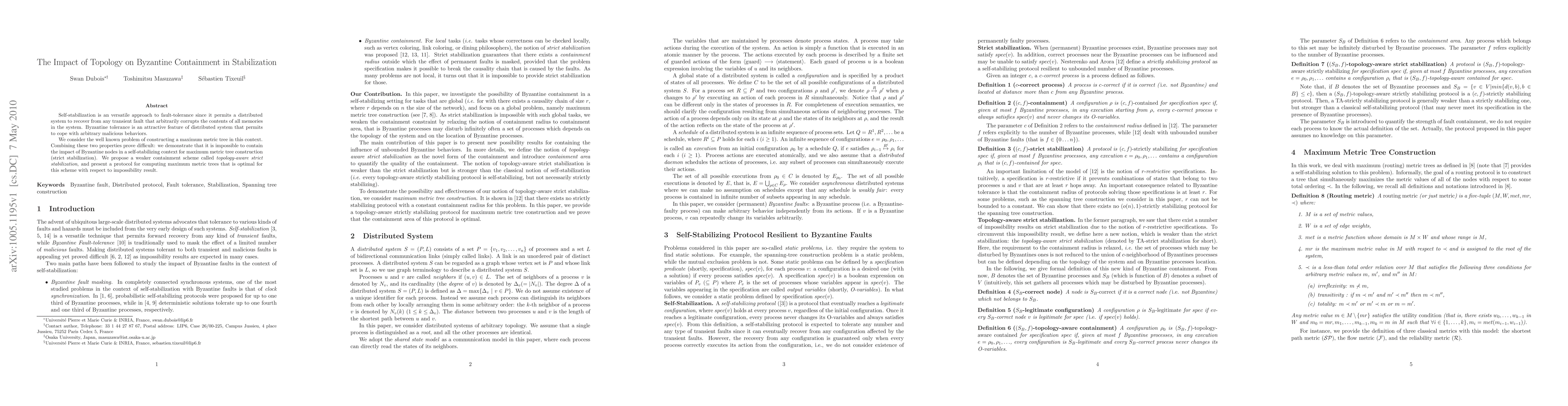 Self-stabilization is an versatile approach to fault-tolerance since it permits a distributed system to recover from any transient fault that arbitrarily corrupts the contents of all memories in the system. Byzantine tolerance is an attractive feature of distributed system that permits to cope with arbitrary malicious behaviors. We consider the well known problem of constructing a maximum metric tree in this context. Combining these two properties prove difficult: we demonstrate that it is impossible to contain the impact of Byzantine nodes in a self-stabilizing context for maximum metric tree construction (strict stabilization). We propose a weaker containment scheme called topology-aware strict stabilization, and present a protocol for computing maximum metric trees that is optimal for this scheme with respect to impossibility result.