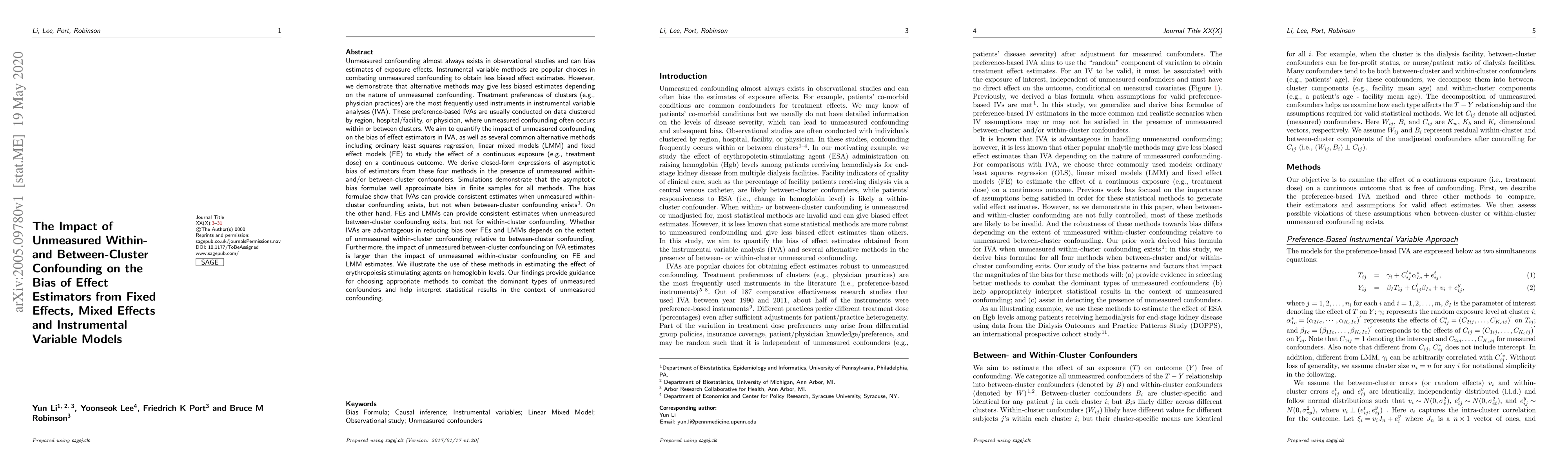 This paper examines how unmeasured within- and between-cluster confounding affects bias in effect estimators from instrumental variable, fixed effect, mixed effect, and ordinary least squares regression models. It finds that while instrumental variable methods can handle within-cluster confounding, they struggle with between-cluster confounding, whereas fixed and mixed effect models are better suited for between-cluster but not within-cluster confounding.