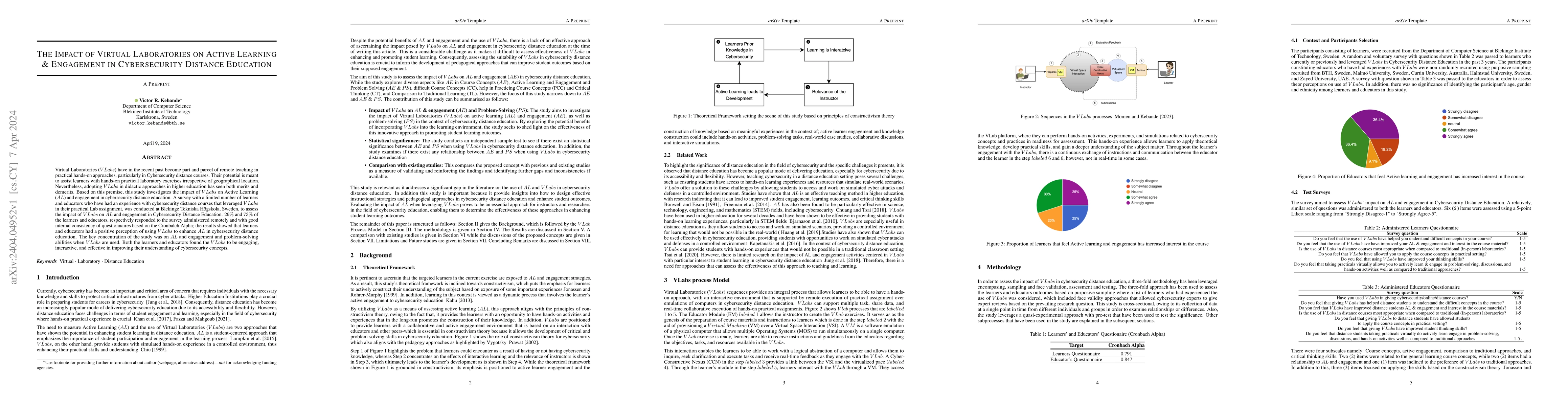 Summary: This study evaluates the impact of Virtual Laboratories (V Labs) on active learning and engagement in cybersecurity distance education. Findings from a survey at Blekinge Tekniska Högskola, Sweden, indicate a positive perception among learners and educators regarding V Labs’ effectiveness in enhancing active learning and engagement, leading to improved understanding of cybersecurity concepts.