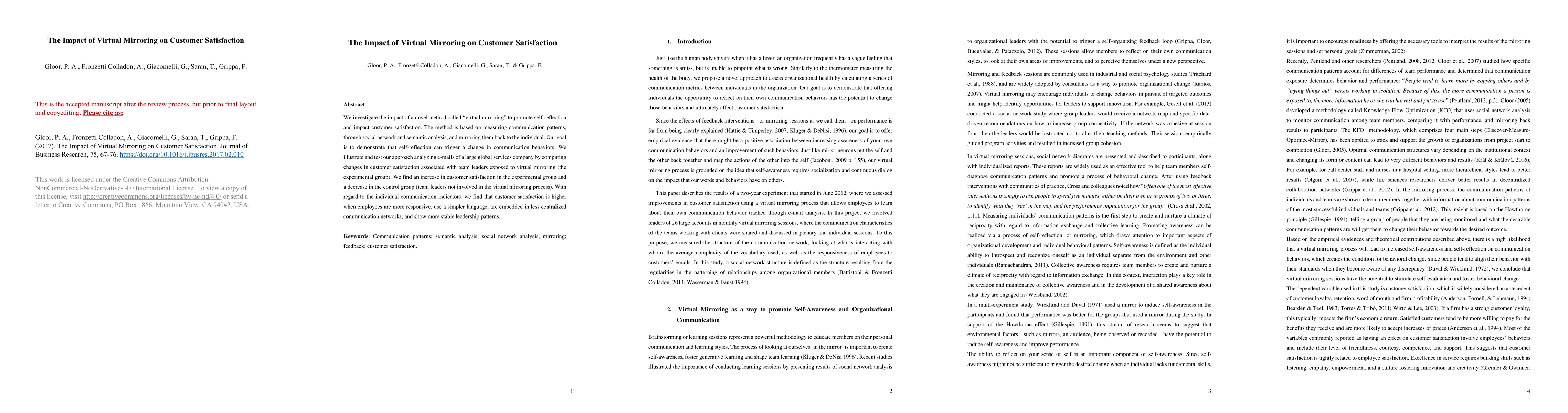 This study explores how "virtual mirroring" enhances employee self-reflection and boosts customer satisfaction by analyzing communication patterns. Results show increased customer satisfaction among team leaders exposed to virtual mirroring, indicating that self-reflection leads to improved communication behaviors.