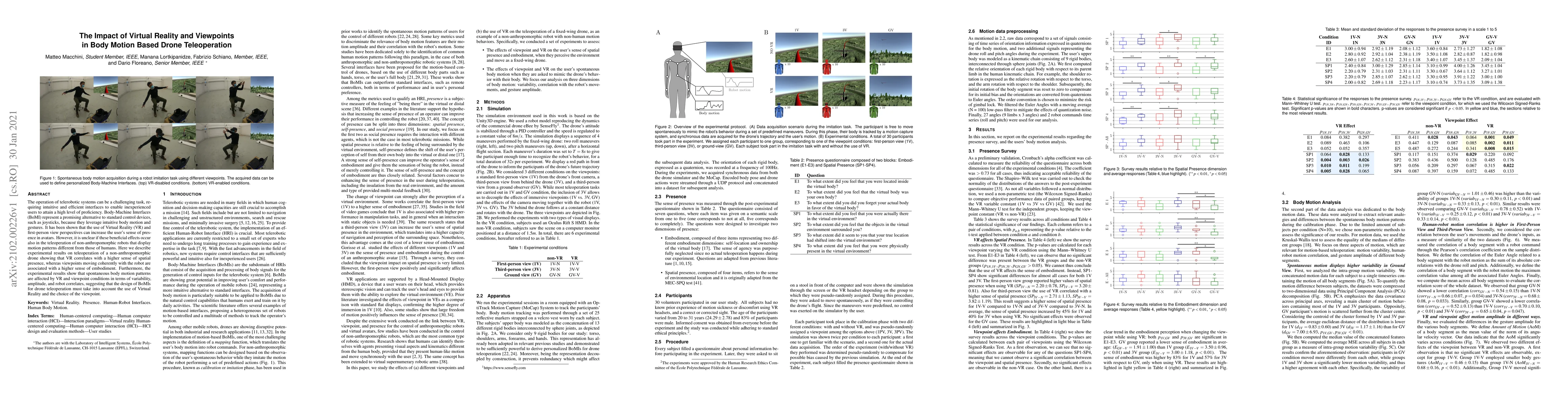 The operation of telerobotic systems can be a challenging task, requiring intuitive and efficient interfaces to enable inexperienced users to attain a high level of proficiency. Body-Machine Interfaces (BoMI) represent a promising alternative to standard control devices, such as joysticks, because they leverage intuitive body motion and gestures. It has been shown that the use of Virtual Reality (VR) and first-person view perspectives can increase the user's sense of presence in avatars. However, it is unclear if these beneficial effects occur also in the teleoperation of non-anthropomorphic robots that display motion patterns different from those of humans. Here we describe experimental results on teleoperation of a non-anthropomorphic drone showing that VR correlates with a higher sense of spatial presence, whereas viewpoints moving coherently with the robot are associated with a higher sense of embodiment. Furthermore, the experimental results show that spontaneous body motion patterns are affected by VR and viewpoint conditions in terms of variability, amplitude, and robot correlates, suggesting that the design of BoMIs for drone teleoperation must take into account the use of Virtual Reality and the choice of the viewpoint.