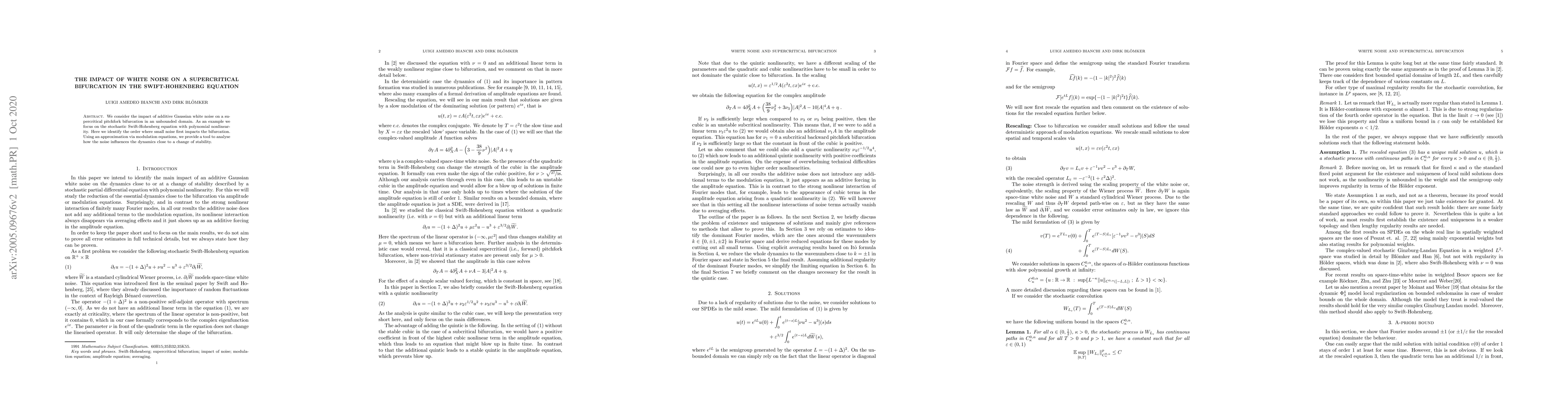 This paper investigates how additive Gaussian white noise affects a supercritical pitchfork bifurcation in the stochastic Swift-Hohenberg equation. The study identifies the order at which small noise first impacts the bifurcation and uses modulation equations to analyze the noise's influence on the dynamics near stability changes.